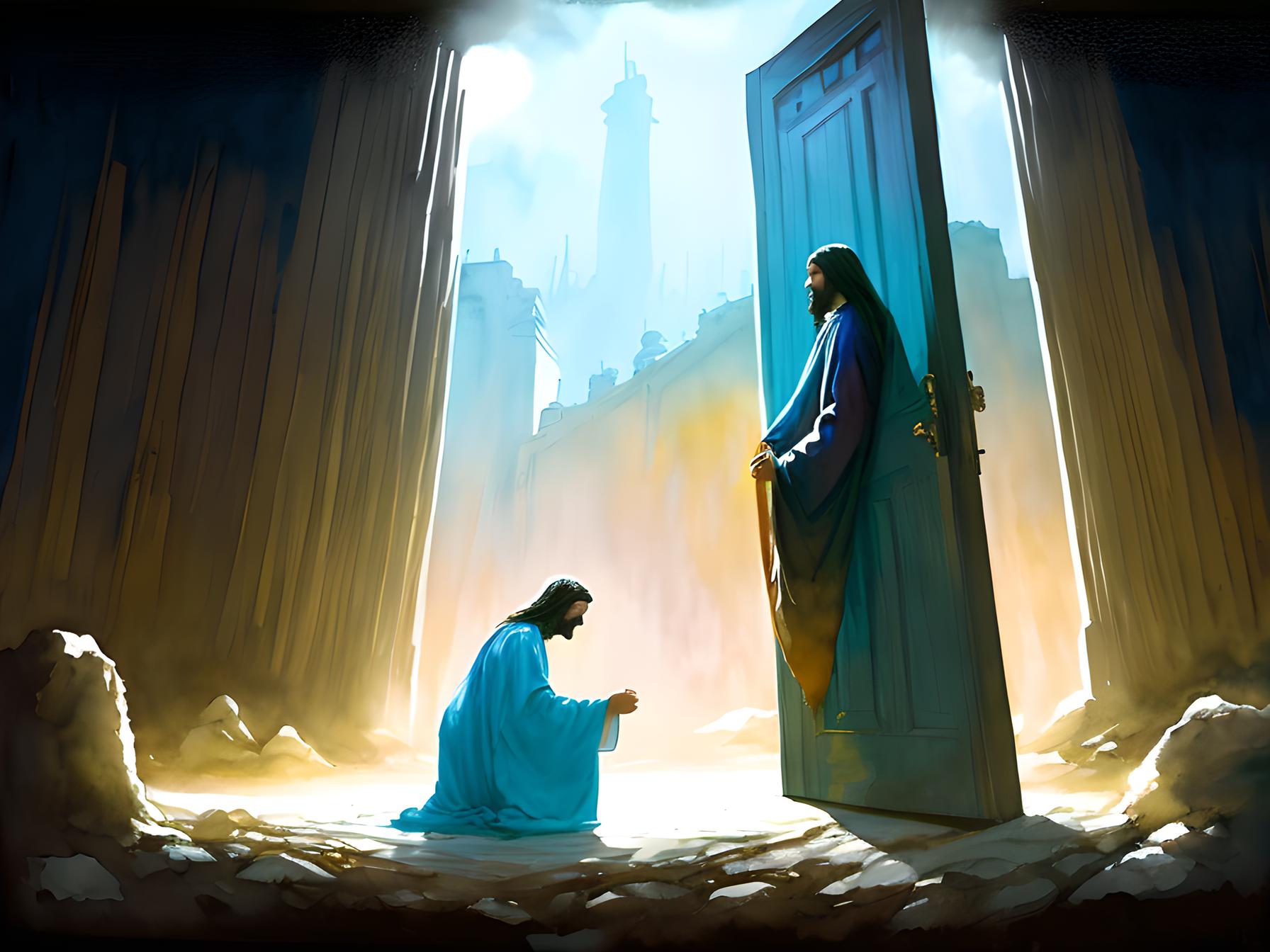 画面是一个门。光闪现里面出现一个人形耶稣的模样若隐若现 现 有一个人朝他跪下。虔诚的捧着手