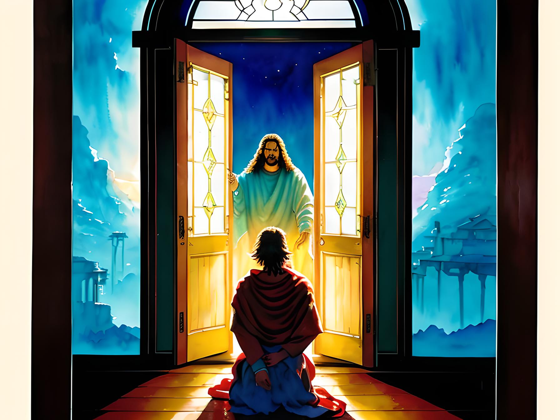 画面出现门。光闪现里面出现一个人形耶稣的模样若隐若现 有一个人朝他跪下。虔诚的捧着手 画面温馨 耶稣脸上慈爱微笑