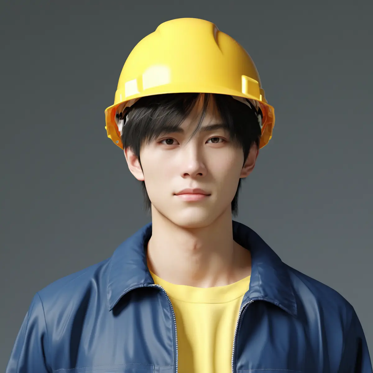 20岁帅气中国男大学生,穿着((长袖深蓝色工装夹克))和((黄色安全帽)),(面容俊秀可爱),身材修长健硕,肩膀宽厚,手臂强壮,身材呈黄金比例,(面带微笑),(面对镜头),大师杰作,衣服平整,最高画质,3D风格,蓝色背景
