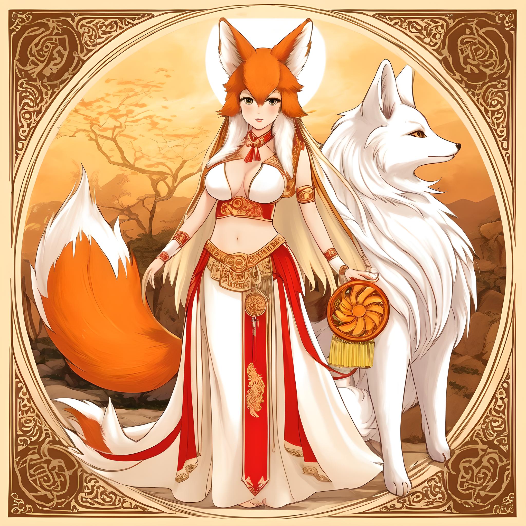 两个大胸古装女孩后面又一只特别大的九尾狐