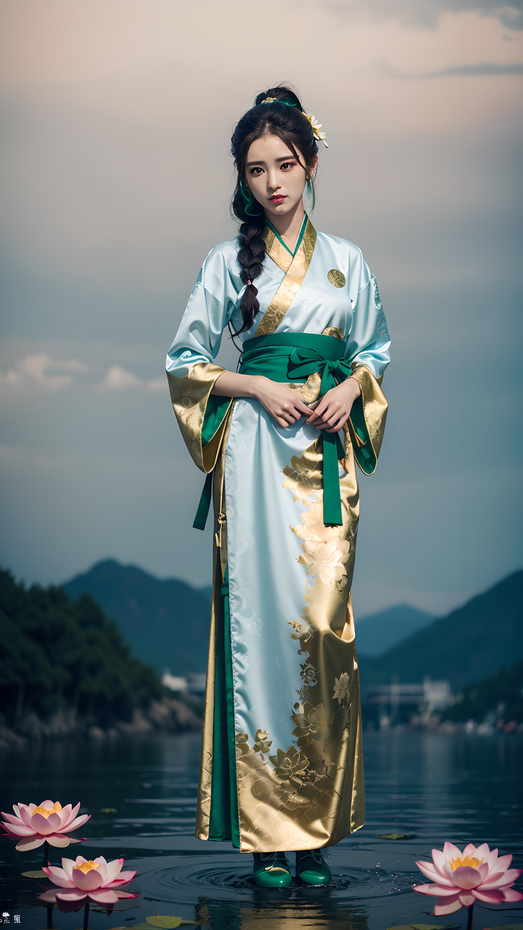 {杰作},{古装美女},(泼墨),国风,(荷花般的美少女,长睫毛),((墨绿色头发:1.01,曲线身材:1.02))(泼墨淡绿色荷花,荷花图案的宝石般的眼睛),((碧绿色印有荷花图案的金边汉服,荷花形状的发簪)),(冷颜:0.6,温柔:0.8),精致的五观,超高画质的,超高分辨率的,精致的线稿。摄影。全身照。