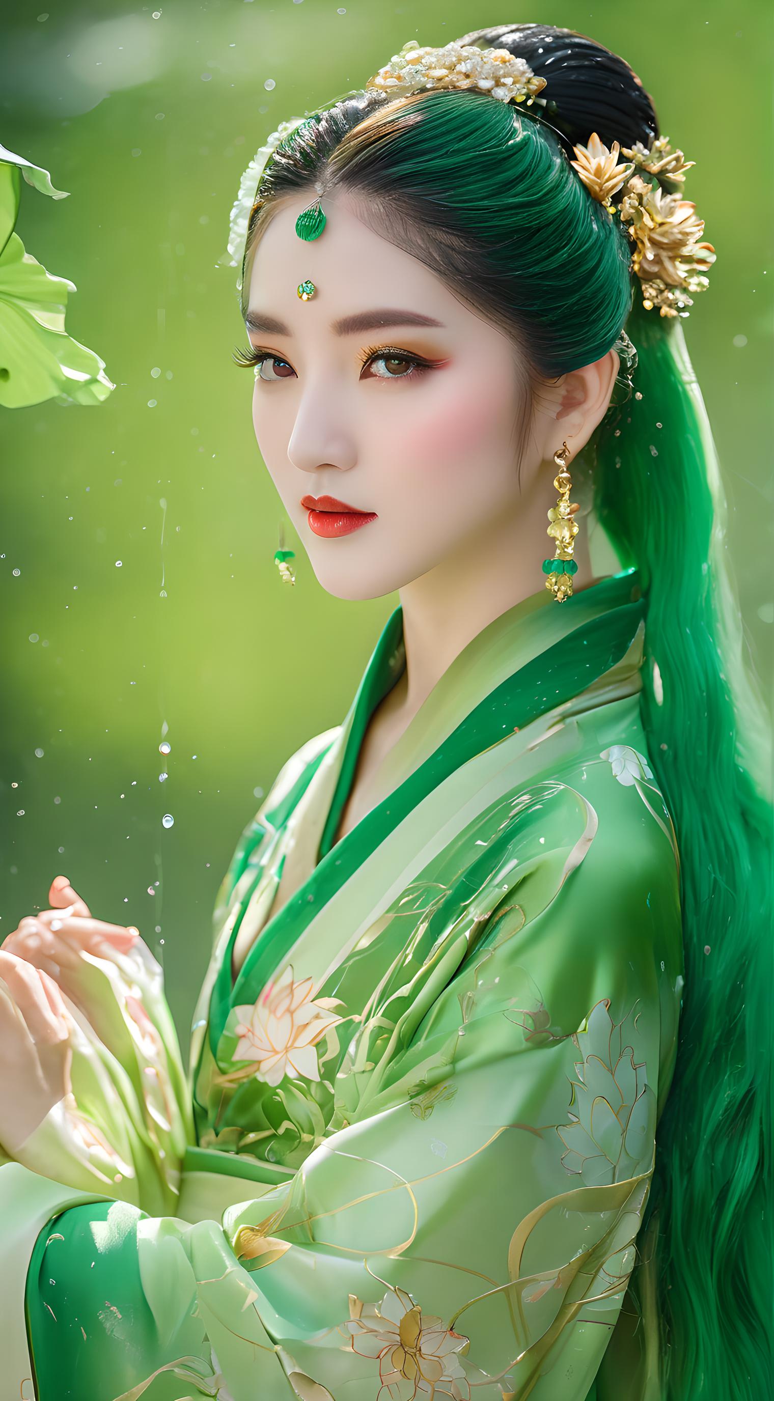 荷花般的美少女,长睫毛,墨绿色头发,曲线身材:泼墨淡绿色荷花,宝石般的眼睛,碧绿色印有荷花图案的金边汉服,荷花形状的发簪,精致的五观,摄影。全身照。