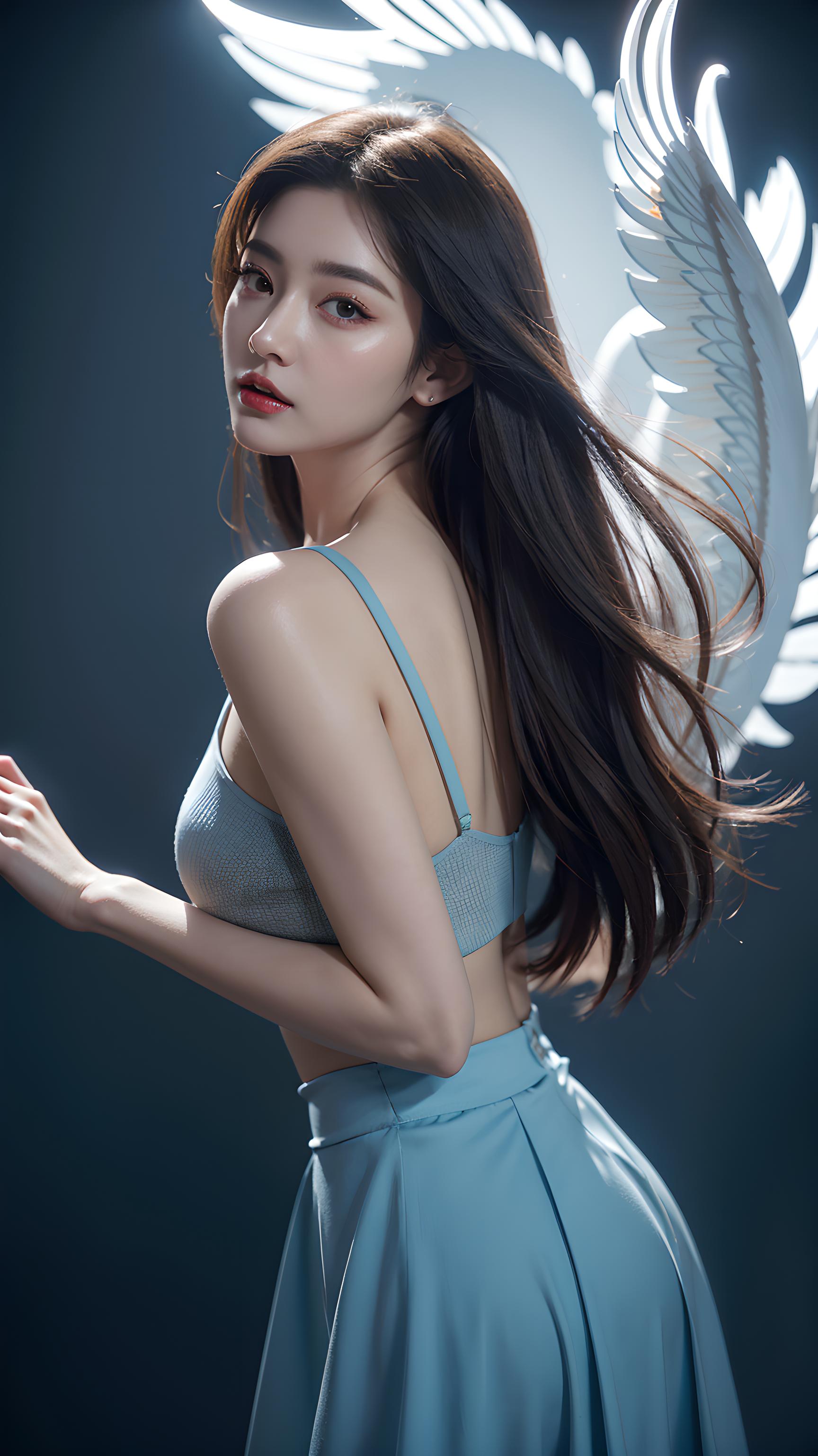 美丽的女孩,气质佳,纯欲风。完美精致的五官,绝美细化的脸,丹凤眼,油润光滑的嘴唇。灵气十足的眼神。白哲肤质,高高的飞天凤钗,身穿浅蓝色修身长裙。摄影!
