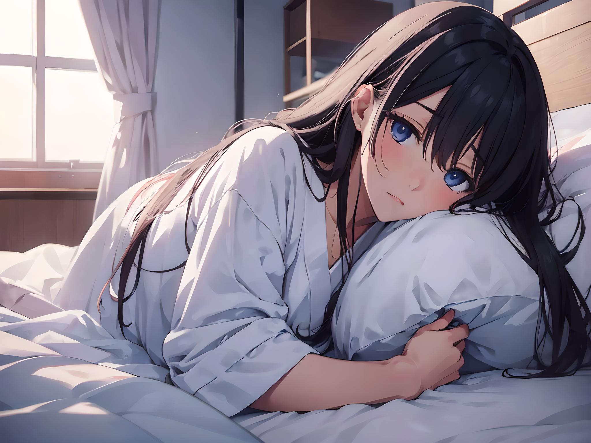 医院,病床上,病号,虚弱,女孩,长发,盖着被子,眼神疲惫,温柔,可怜,日本漫画