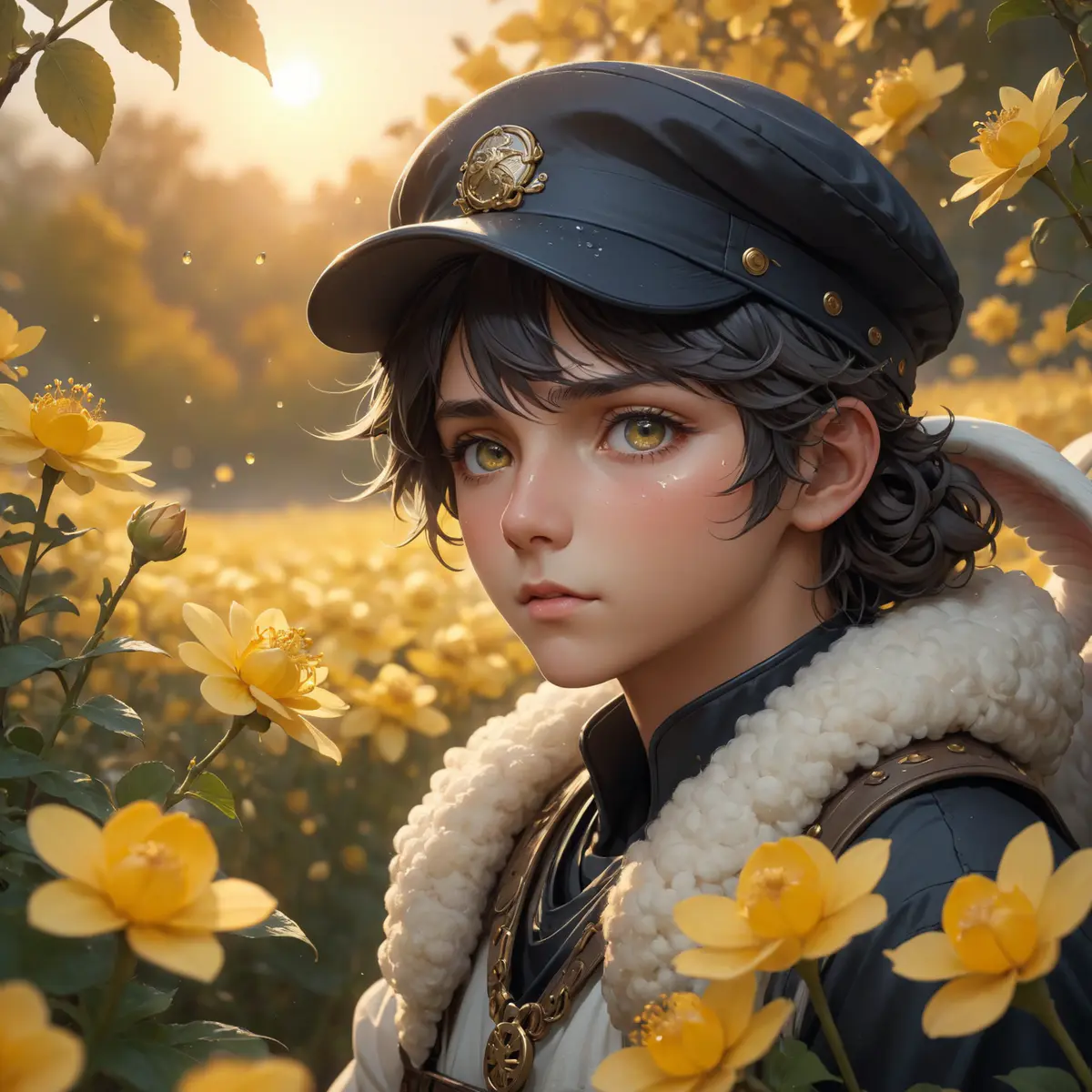 景深,忍者,恶魔眼,哭,,项链,海军陆战队服,鸭舌帽,羊角,前倾,背对背,落日,穆夏风格,森罗法,大师作品,最好画质,高细节,男孩,天使,单人