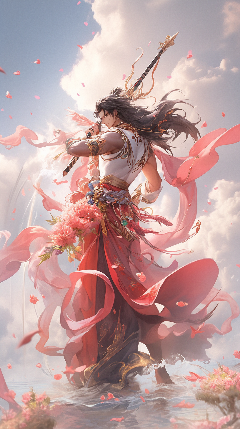 神话人物花冠武神,尊贵典雅,有气质,美男,一手舞长剑,另一手拿一支桃花,身在祥云里,天空飘着花瓣,远处云雾缭绕,中国神话,天庭为背景,色彩丰富,厚重,最高画质,8K分辨率,电影质感。花冠武神通常被描绘为一位美丽绝伦的男神,他拥有乌黑的长发、明亮的眼睛和柔和的面庞。他的面容宛如春天里的第一朵绽放的花朵,充满了生机和活力。花冠武神的服饰也极为华丽,常常穿着白色长袍,绣着华丽的金色龙纹,身上散发出淡淡的花香,使人感到宁静和舒适。