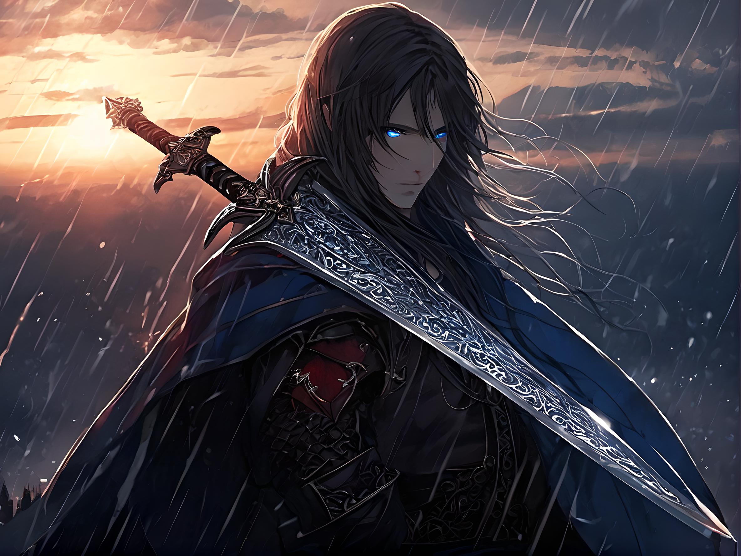 面前这把剑,通体蓝色,剑刃银白,剑柄缠绕着诡异的花纹,周身散发着冷冽的气息。我抬手指尖滑过冰凉的展柜玻璃,恍惚之间,身处一片乱石岗。仰首只见天色愈暗,落日余晖,天边一片血色霞光,冰冷的气场也遮掩不住来自剑芒深入的杀气,所握剑柄之人一头灰白长发飘扬,面具缓缓卸下,深蓝色的瞳眸暗含杀机。