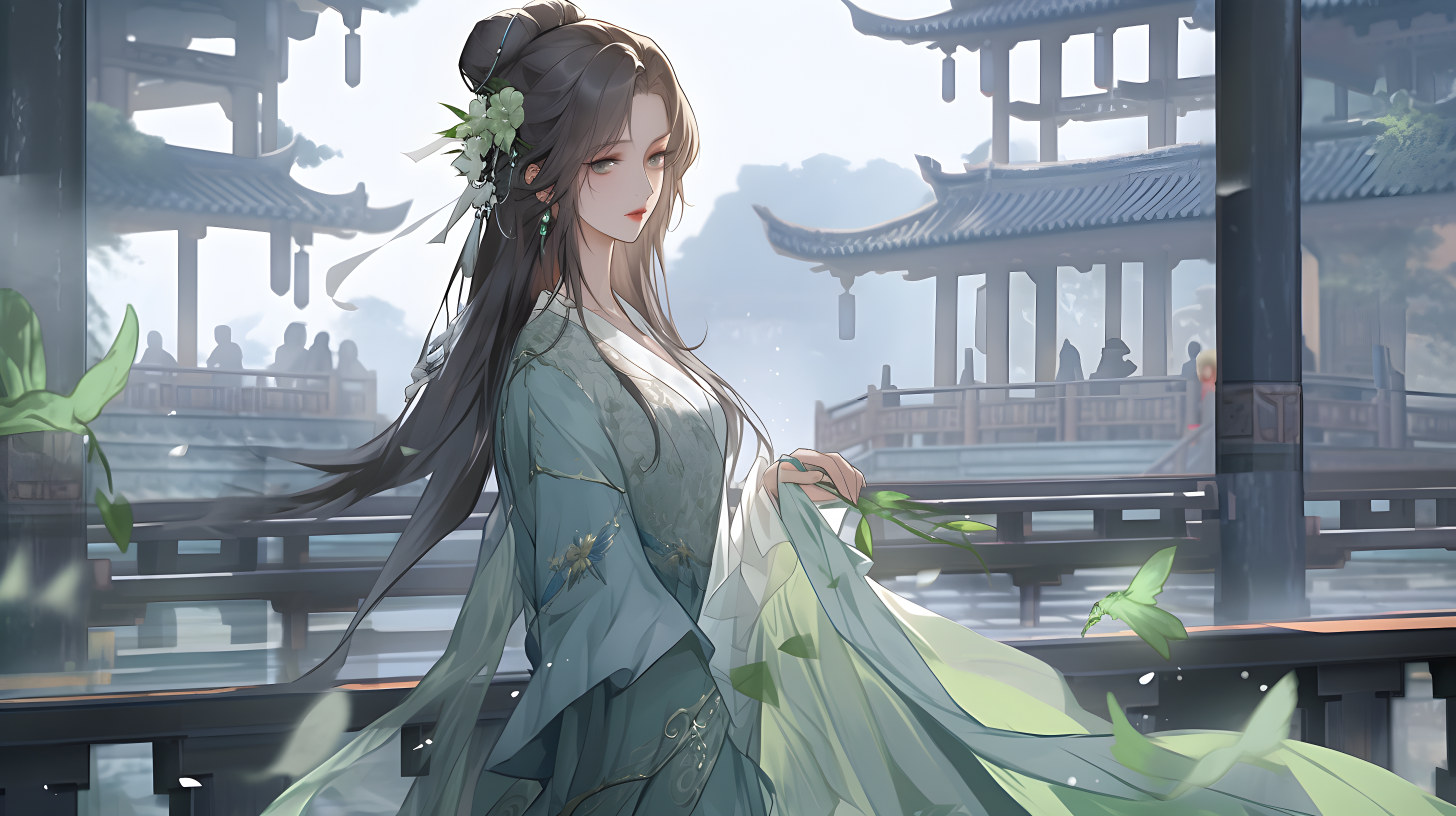 优雅女子、汉服、中国古风、绿色长裙、青丝如瀑、修长身材、清冷目光、走下台阶、周围古风建筑
