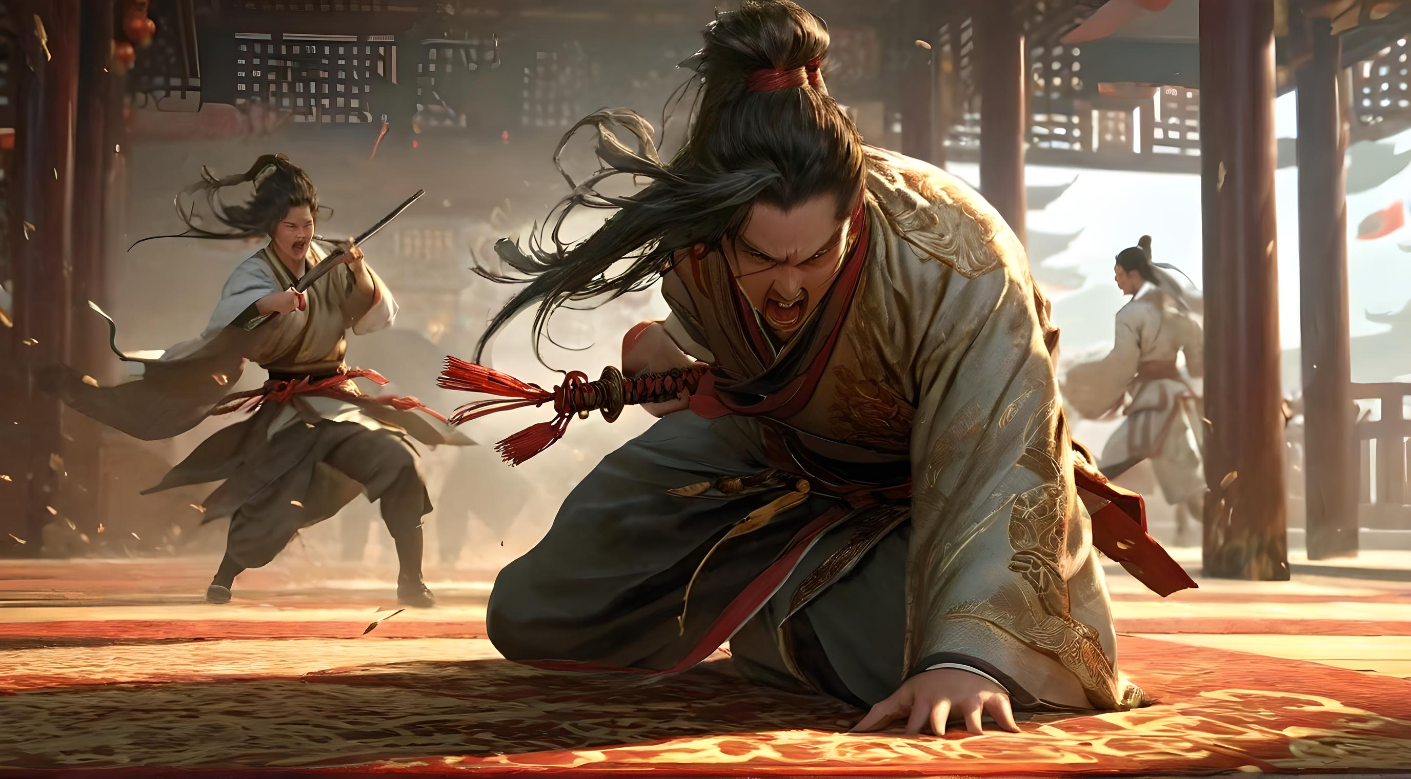 ((2man,fierce battle,looking at each other,,1man (lying,being trampled,spitting blood),looking frightened,,1man (standing,trampling,looking powerful),handsome face)),full body,fighting