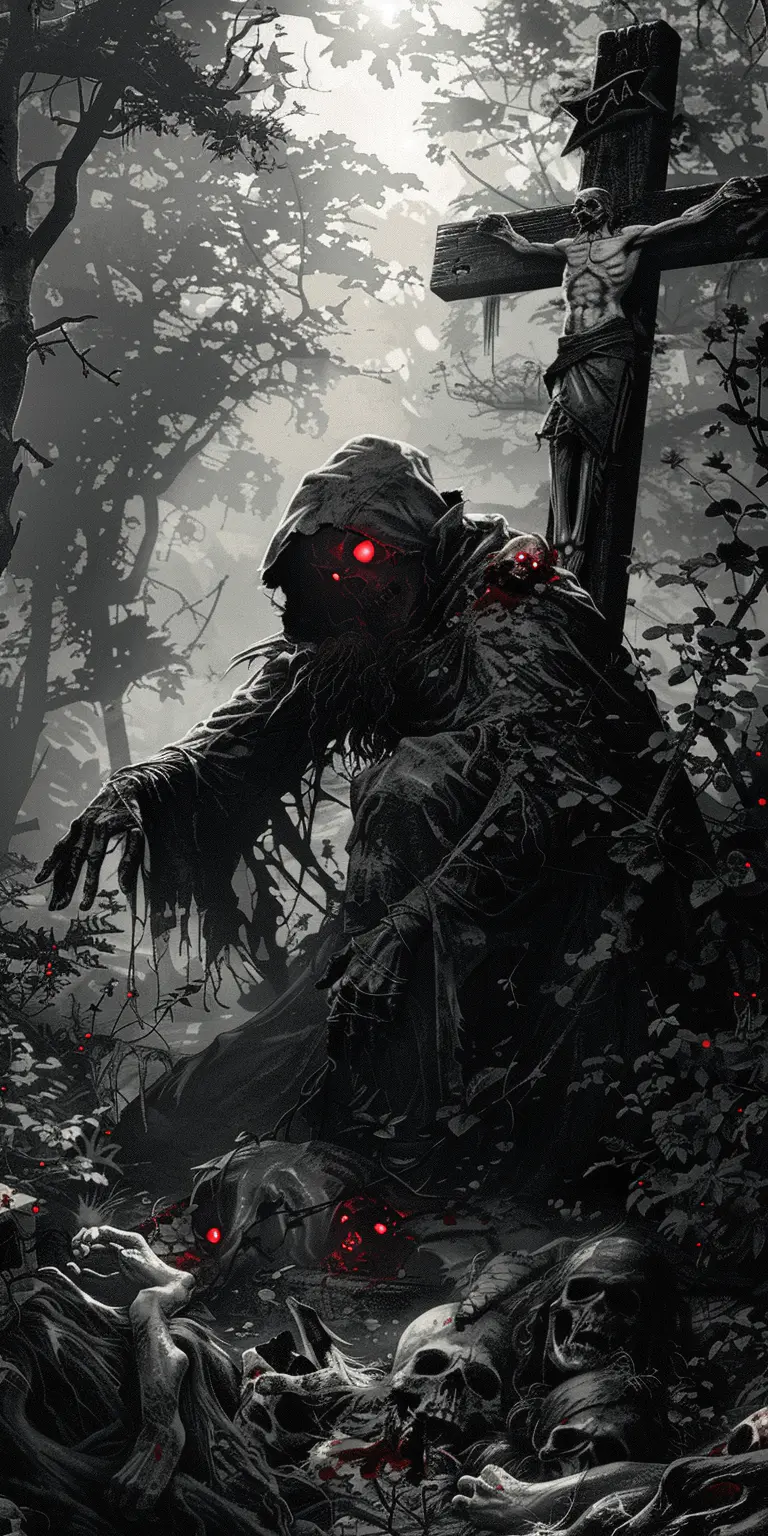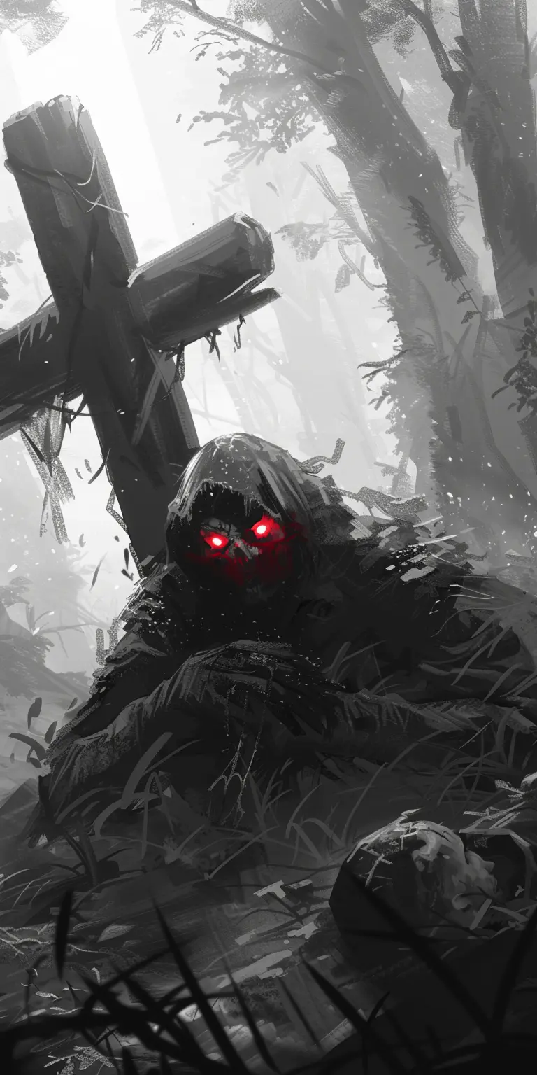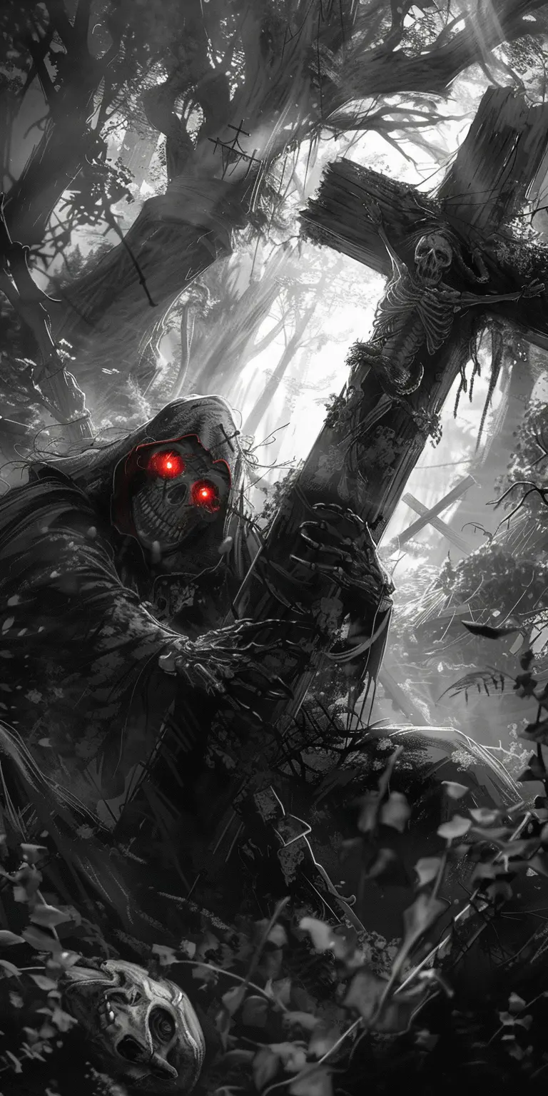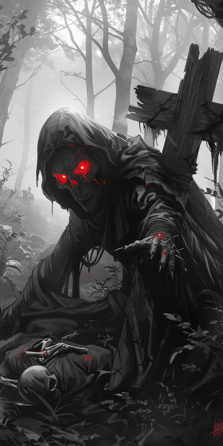 A black and white digital painting of an evil grim reaper with red glowing eyes, he is laying on his side in the dark misty forest. He has long arms reaching out to grab you from behind. The background features detailed shading and highlights that give him a ominous presence. In front there's a large wooden cross on which lies dead bodies.