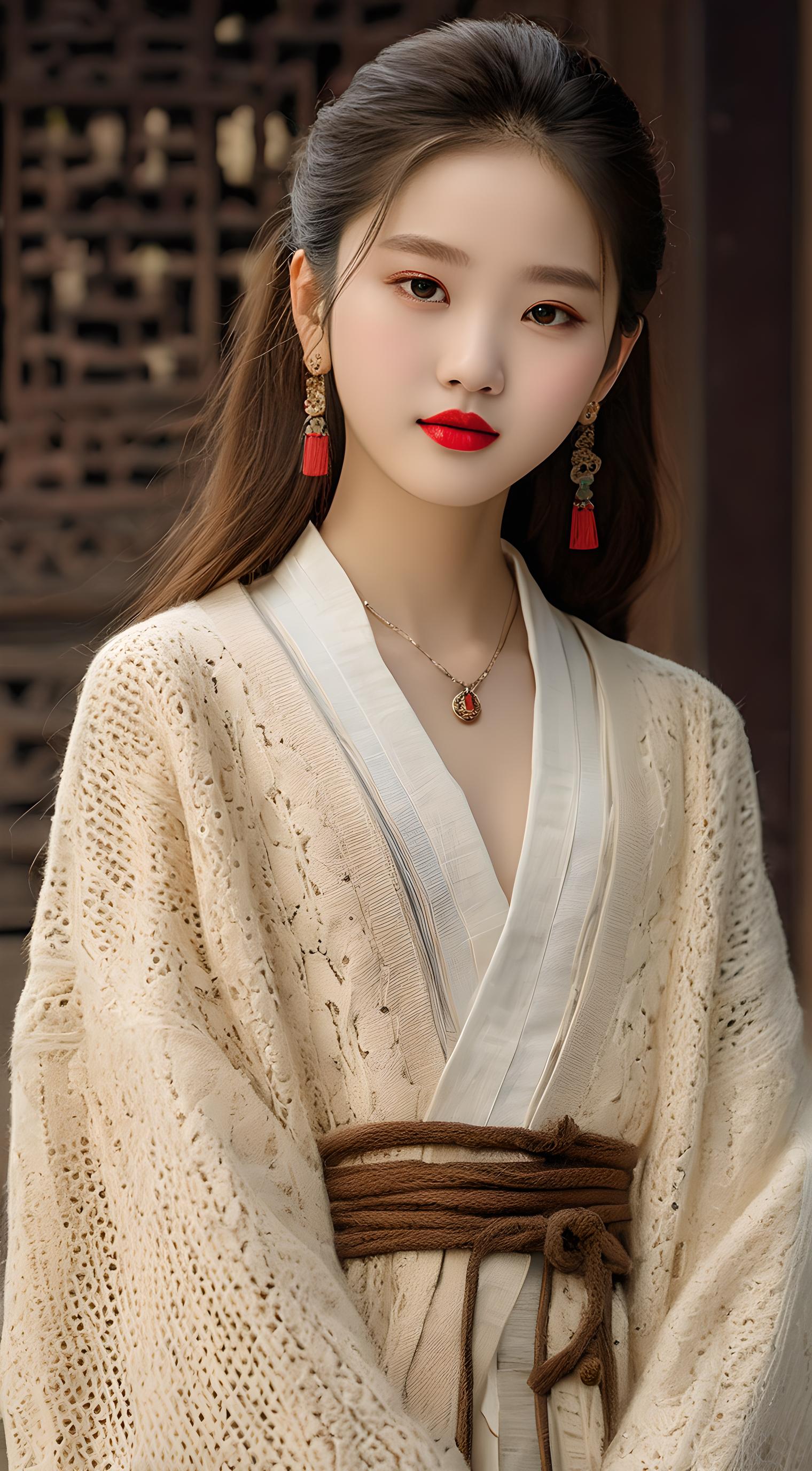 童颜少女,完美脸庞,清纯,可爱,古风,宋韵,新中式,全开衫,蕾丝,拼接,厚重,低领,,耳环,口红,项链,清纯风格。全身,现实主义,细节增强,画面真实质感。