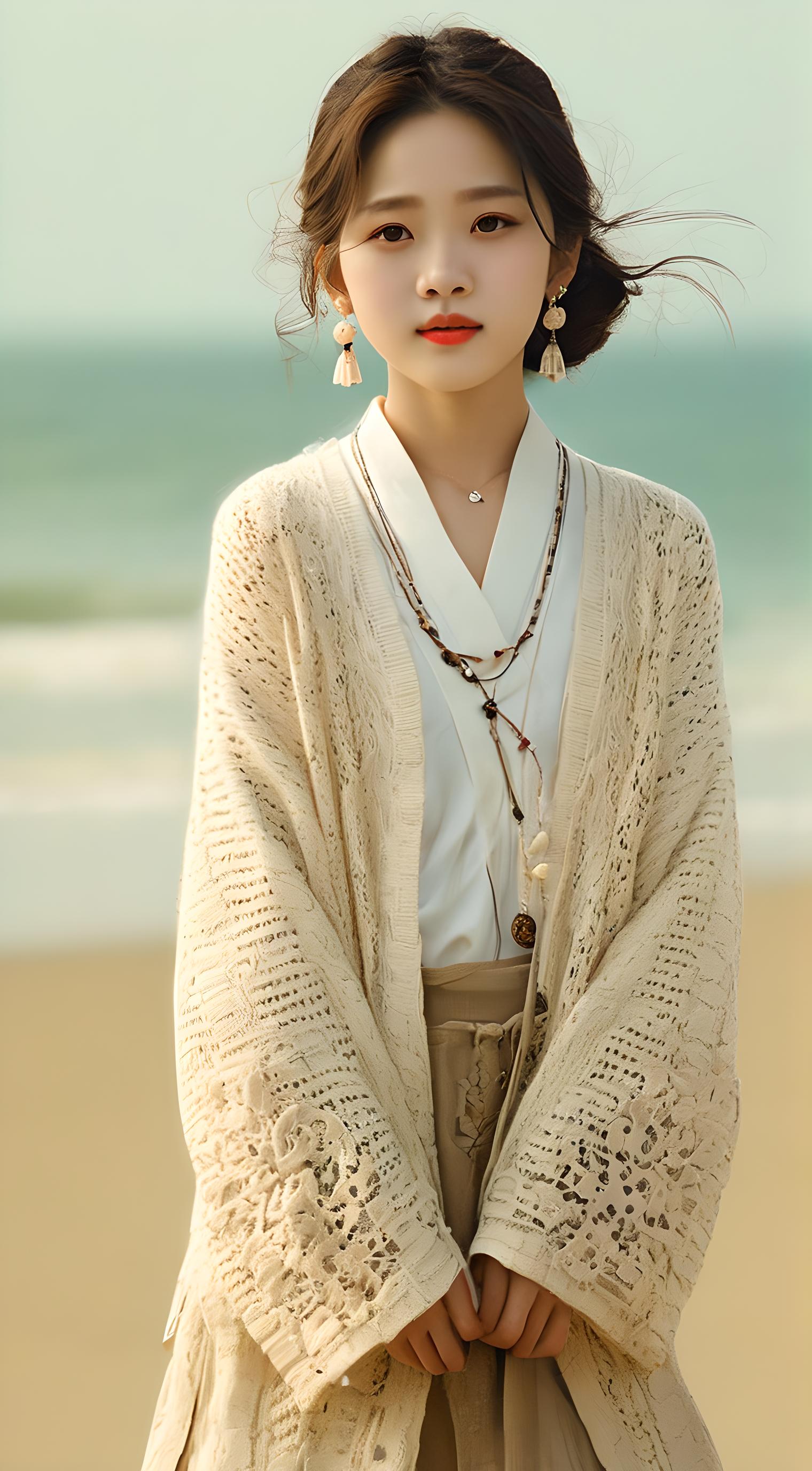 童颜少女,完美脸庞,清纯,海滩,可爱,古风,宋韵,新中式,全开衫,蕾丝,拼接,厚重,低领,,耳环,项链,清纯风格。全身,现实主义,细节增强,画面真实质感。