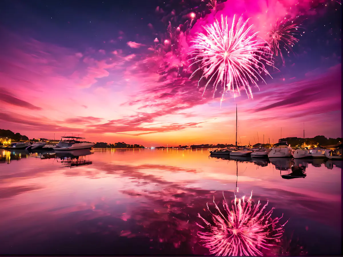 粉红色的天空和白云背景下,粉红色的烟花如云朵般绽放,为视觉带来美的震撼。河水面上的小船在倒影中翩翩起舞,与五颜六色的天空形成对称构图,显得更加壮观。广角镜头拍摄,提供远处景色的同时,用粉色和黄色的光燃烧出五颜六色的星空和粉色的倒影,宛如画布上的一幅抽象艺术品,凸显华丽氛围。