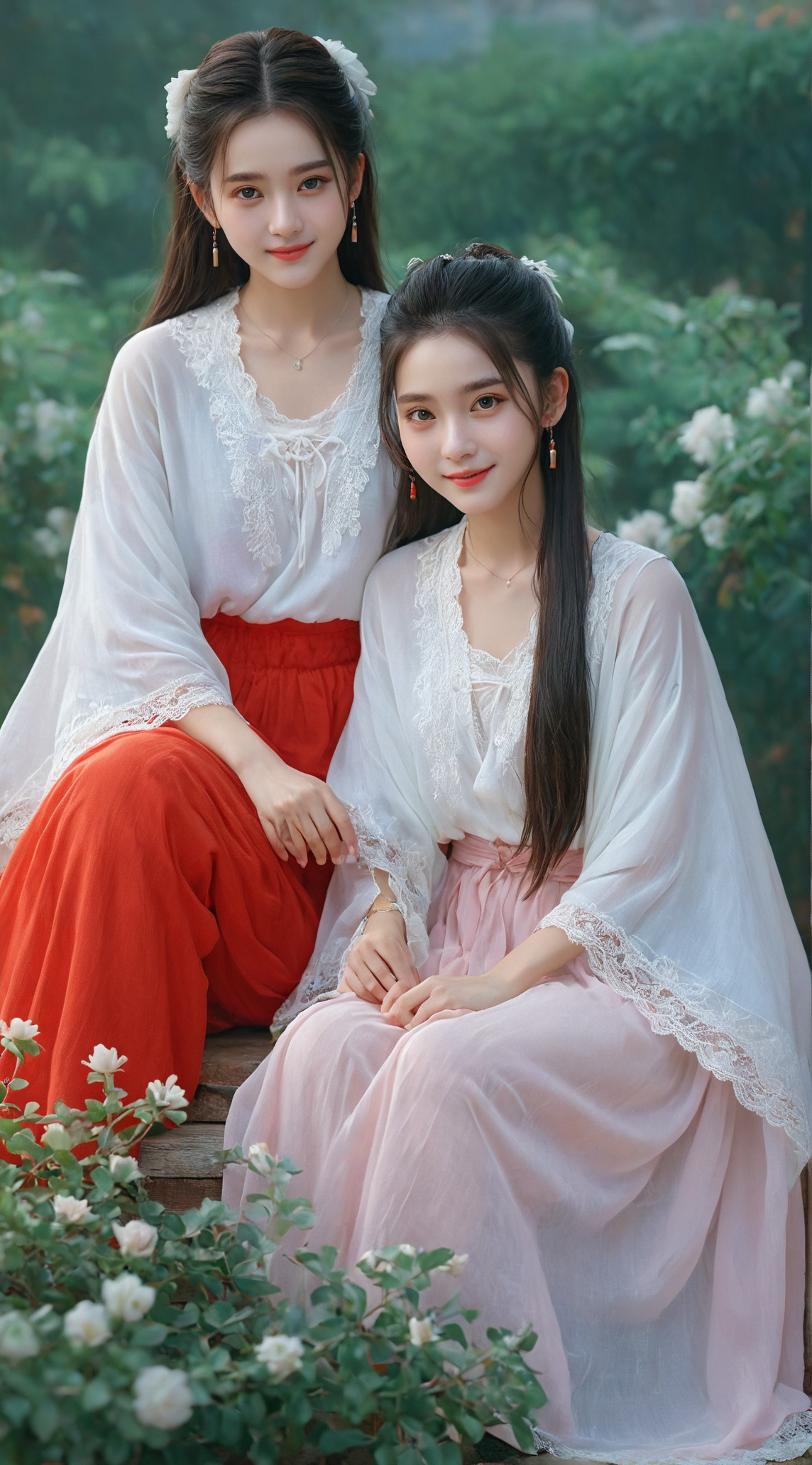 精致的五官,大师作品,最佳品质,更高质量,超高分辨率,8k分辨率,18岁美少女,大学生,2姐妹披肩长发,开心的表情,微笑,院子,高挺胸部,蕾丝小吊带纱裙披肩,全身画面