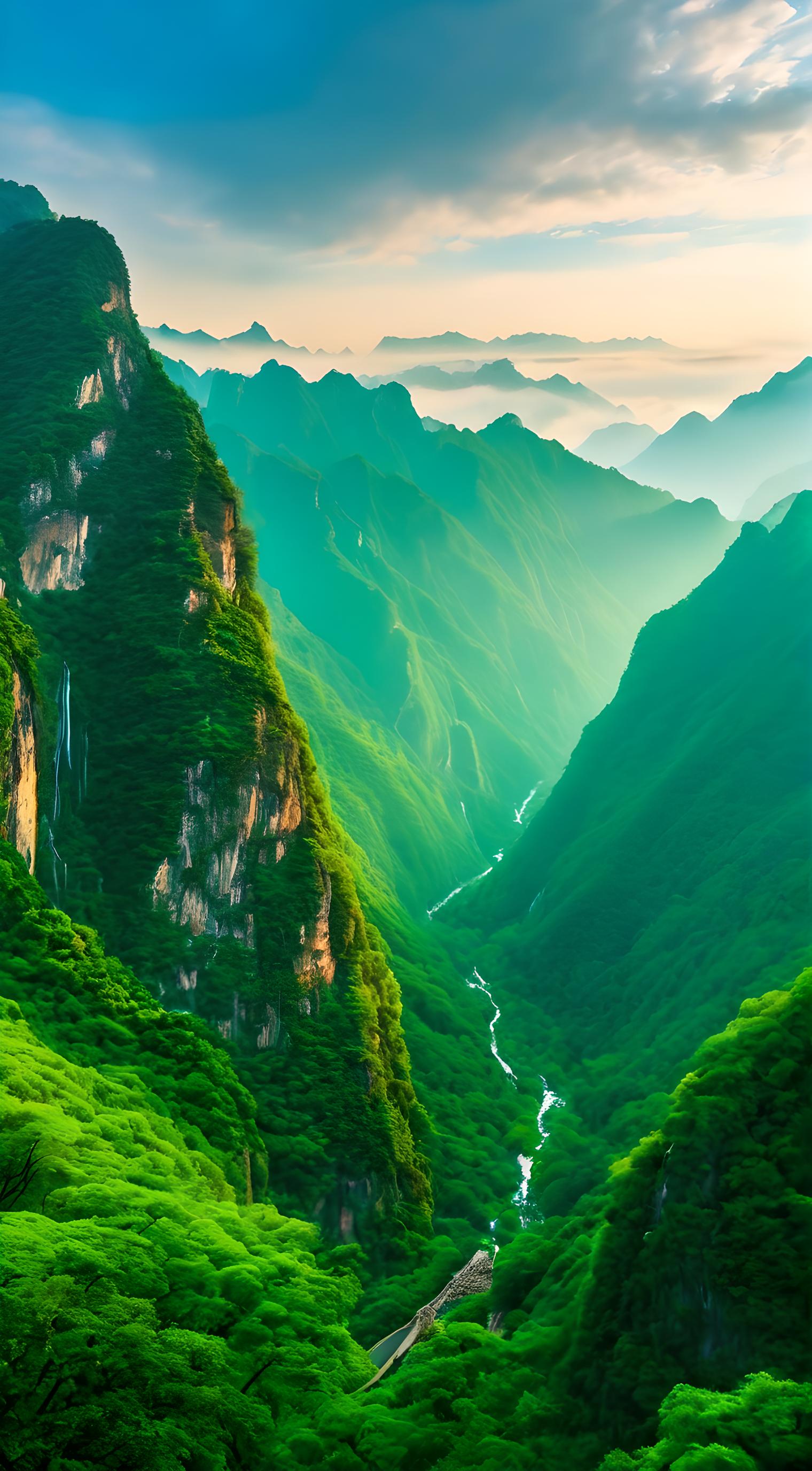 千韧山岚,云里雾里时隐时现,天空如蓝,云彩夕阳西下,如火如画,山岚风景如画,竹林绿水青山,古道西风瘦马,断桥人在天崖。摄影。