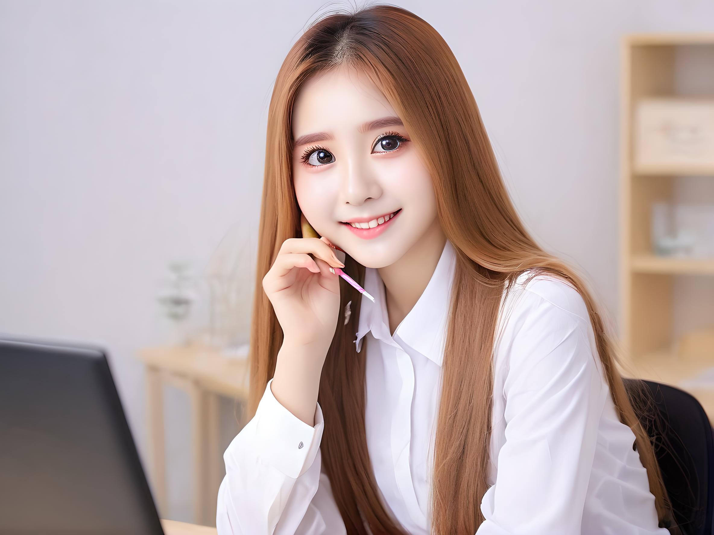 高细节,8k分辨率,超高分辨率,一个稚嫩少女可爱的少女,彩虹色亮光长发,彩色清澈眼眸,(顺滑的头发,锁骨,精致完美的五官,最美的大眼睛,长长的睫毛,眼睛甜美有卧蚕,微笑,动态角度,极致画质,最高精度,精准完美的人体结构,(办公室),(工作服)工装,工装裤,微笑,长发,开心的笑,大眼睛,小姐姐在工作室时一般会认真工作,她通常会穿着整洁得体的(白色衬衣),梳理好头发,保持仪表端庄。坐在办工作前里,她会用一只笔记本电脑或笔和纸记录重要内容,办公室