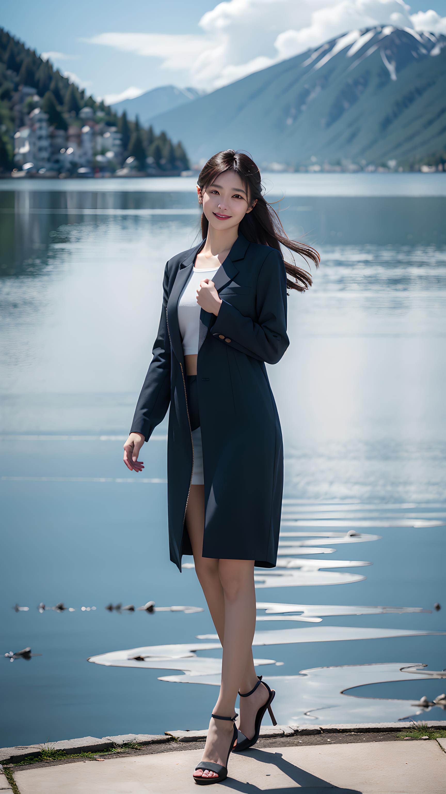 原创,杰作,哈苏相机拍摄,一个穿着时尚女装的女模特,她的笑容灿烂,正在洱海边进行旅拍。她的服装时尚,与美丽的洱海景色形成鲜明对比,人物位于画面的中央,呈现出写实风格。大师作品,摄影风格,正面视角,半