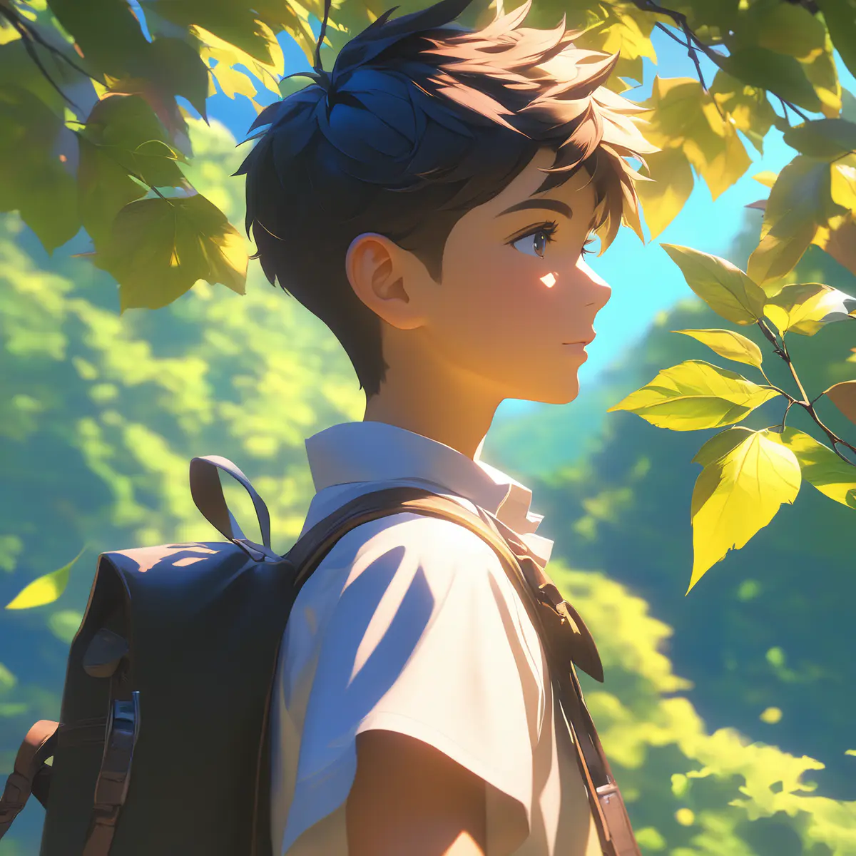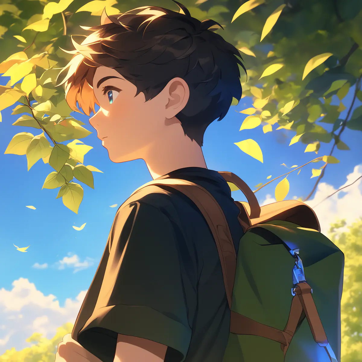 一个男的短发,站在一棵树的旁边,有树叶落下,树叶是云的形状,男人的背对着镜头,延着男人的目光有一条路