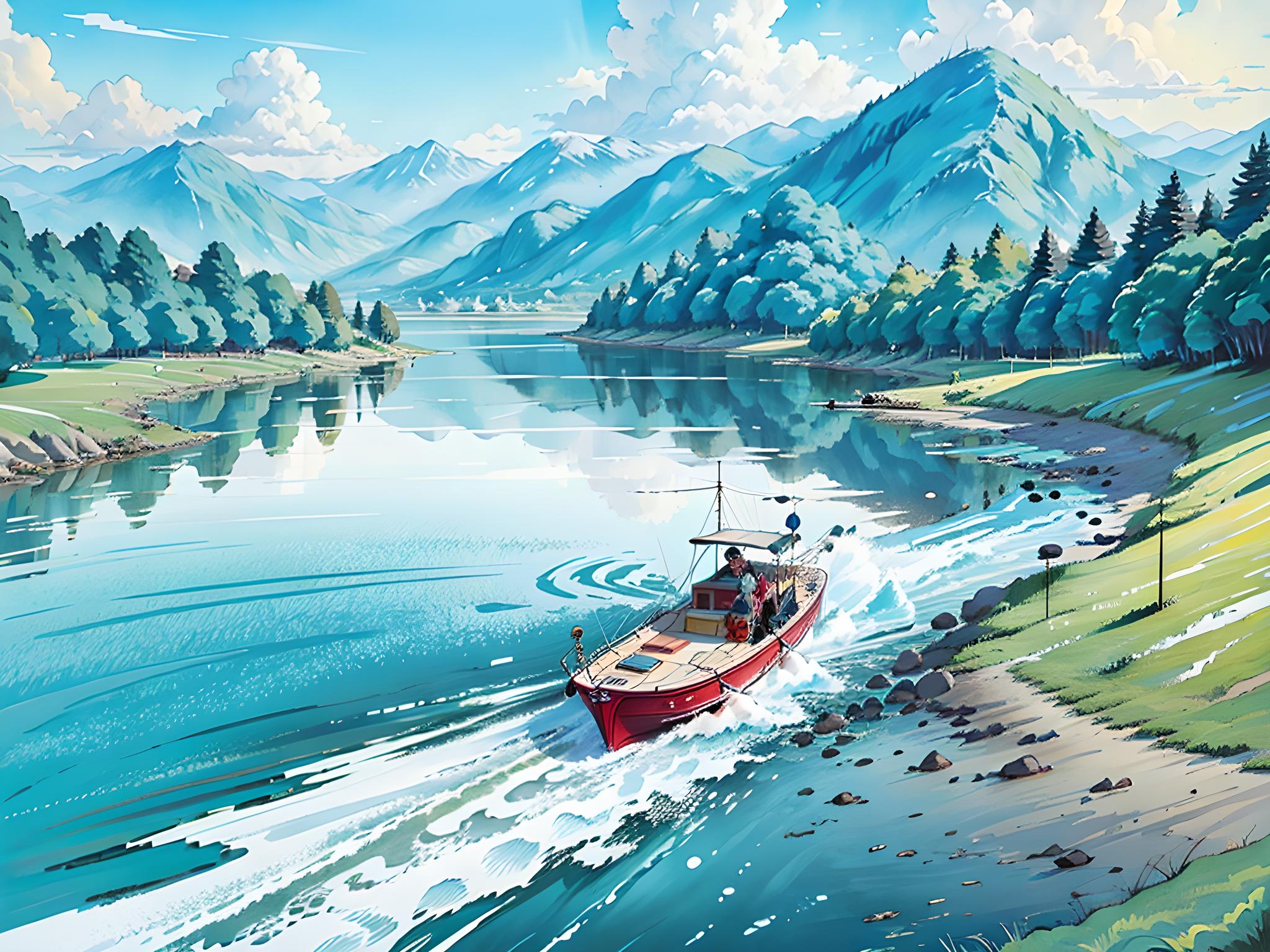 快艇开过的湖面泛起波光粼粼