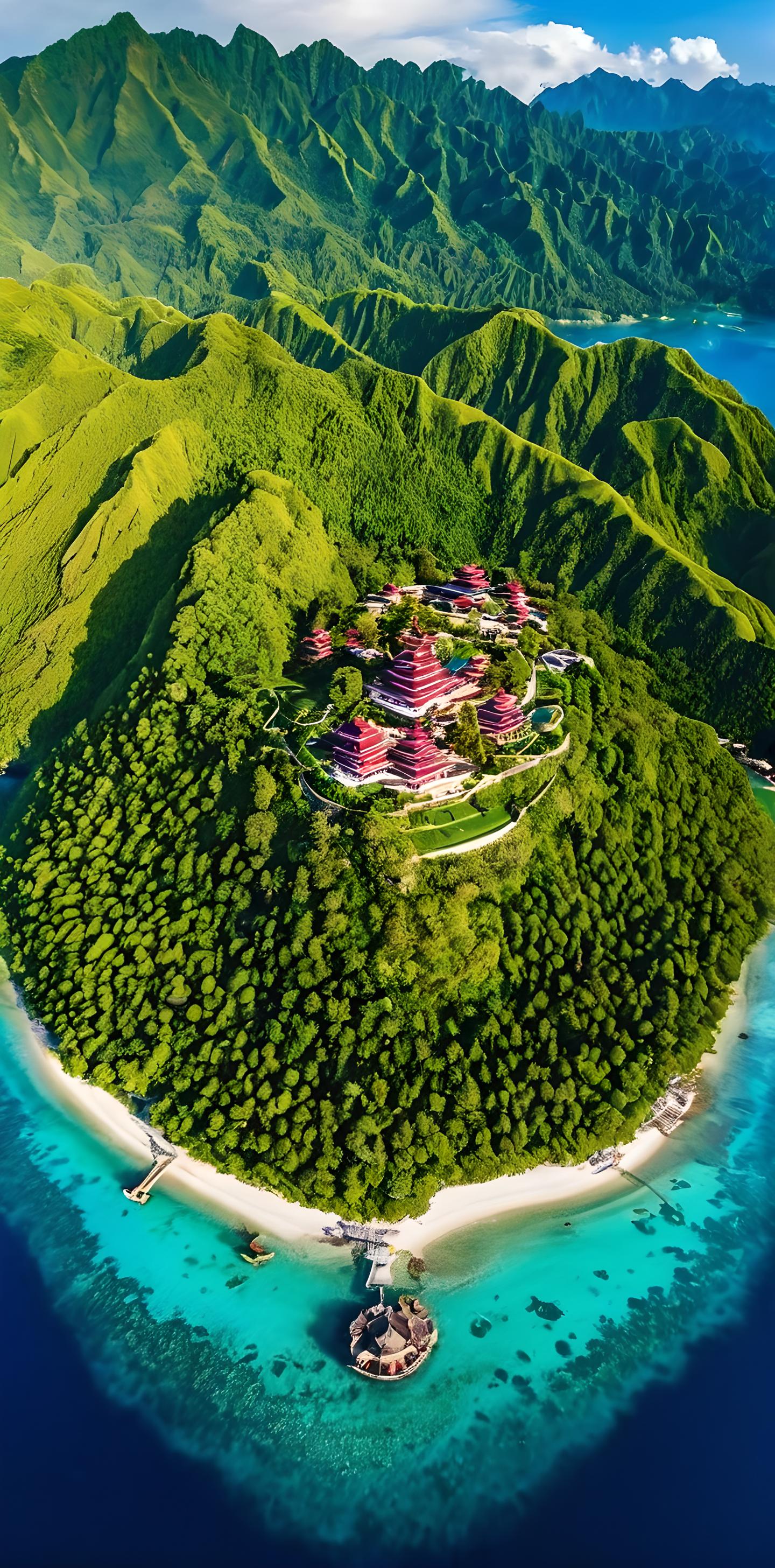 一岛一世界,一千零一夜。从高空俯视,春意盎然,世外桃源,如梦幻的仙境。灯光通明