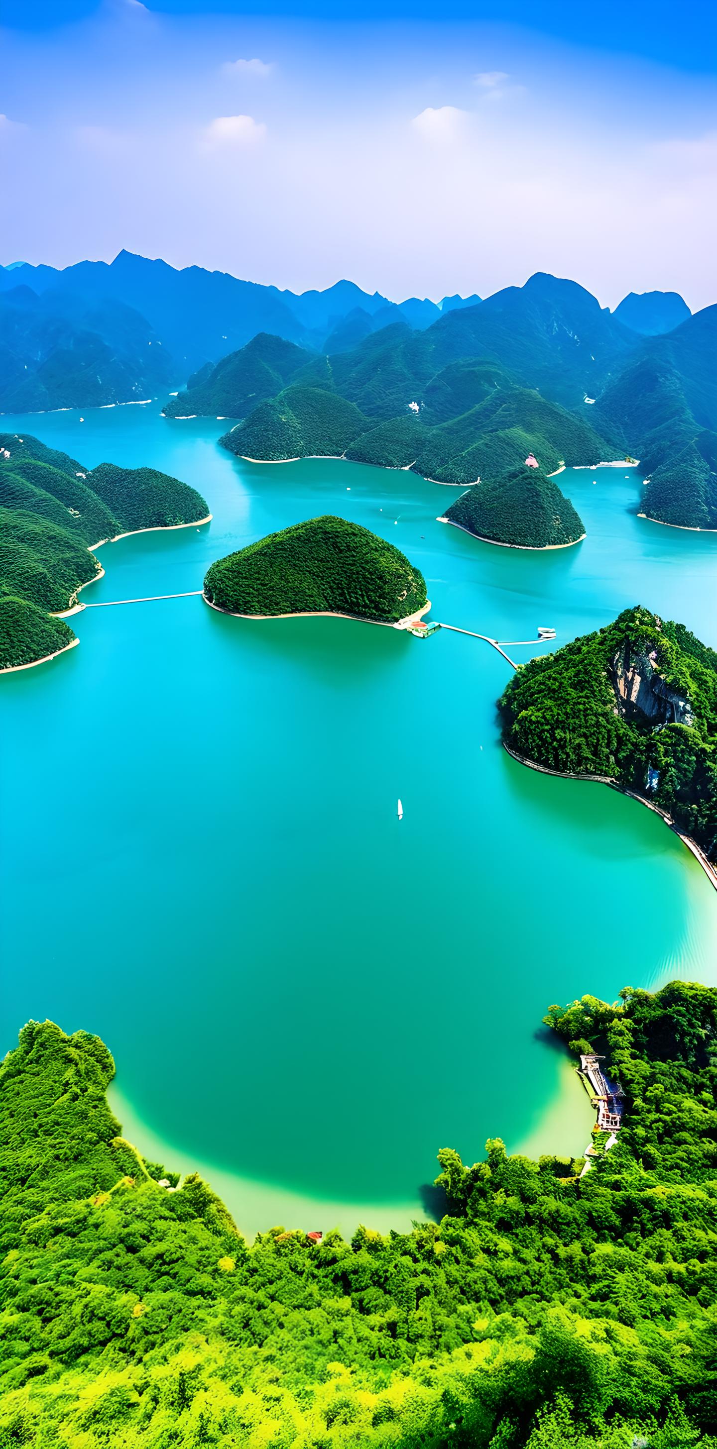 千岛湖,是一座人工湖。它以其清澈的湖水、众多的岛屿和秀美的山水而著名,是一个重要旅游胜地。经过大坝的拦截形成了这个巨大的水库。湖内有大小岛屿上千个,其中最大的几个岛屿如梅峰岛、渔乐岛、龙山岛等,都有着丰富的自然景观和人文历史。这些岛屿点缀在湖面上,宛如一颗颗璀璨的明珠,与周围的青山绿水相映成趣。千岛湖的水质非常清澈,湖水透明度高,可以直接看到湖底的沙石和游动的鱼群。湖水中生活着大量的鱼类 在湖周边的山区,分布着许多古老的村落和古迹,如梅城古镇、石林风景区