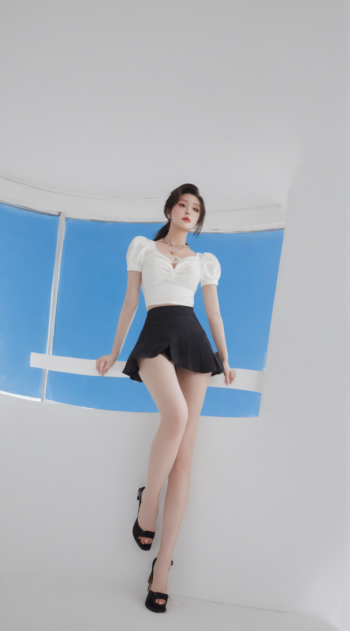 最好画质,8k,精致细节,绝美性感包臀裙御姐,长睫毛,大眼睛有卧蚕,腮红,水润粉唇,精致妆容,(面部特写)((全身照)),(修长的双腿),白嫩肌肤,(((穿着白色职业装,丰满大胸前凸后翘,黑色包臀开叉短裙))),锁骨,项链,凌乱长发,丰满胸部,