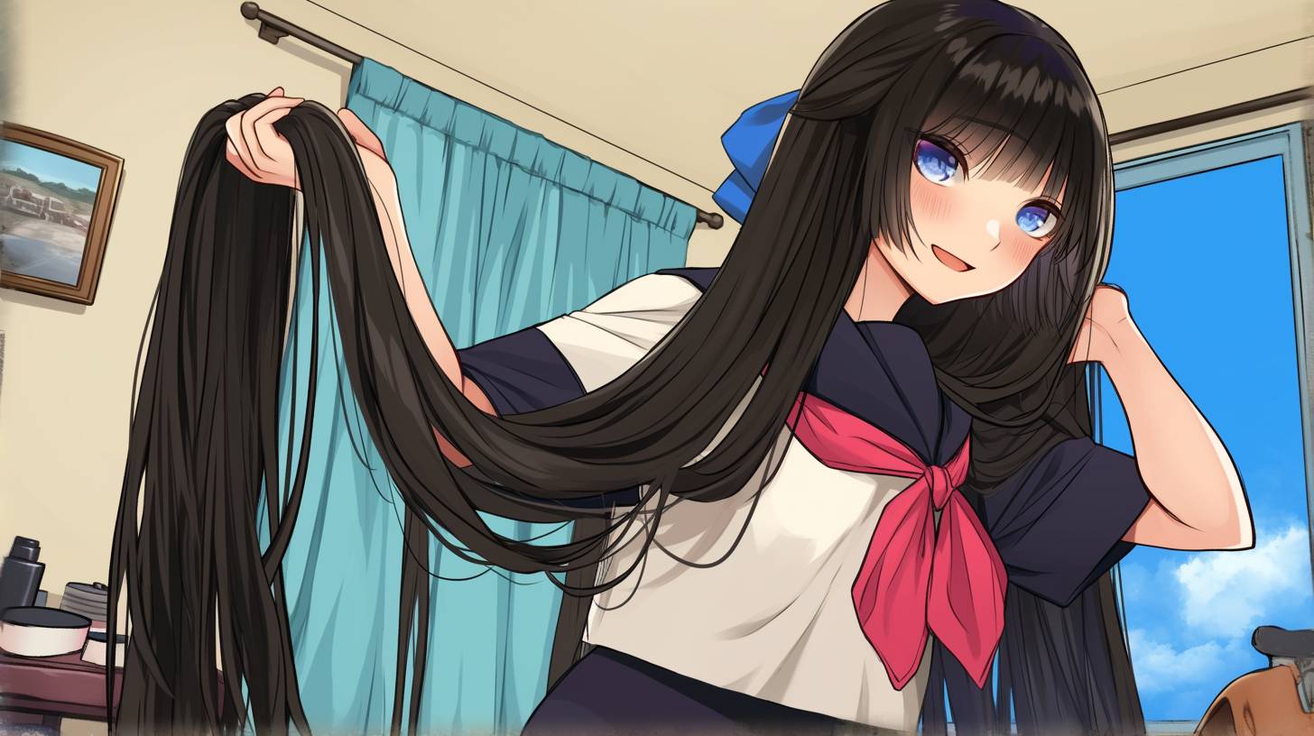 masterpiece,best quality,杰作,高质量,8K;卧室,落地窗,蓝天,白云,水手服;petite,娇小的身材,美少女;开心;碧绿色的发带;black hair,absurdly long hair,浓密的头发,直发,柔顺的头发;
