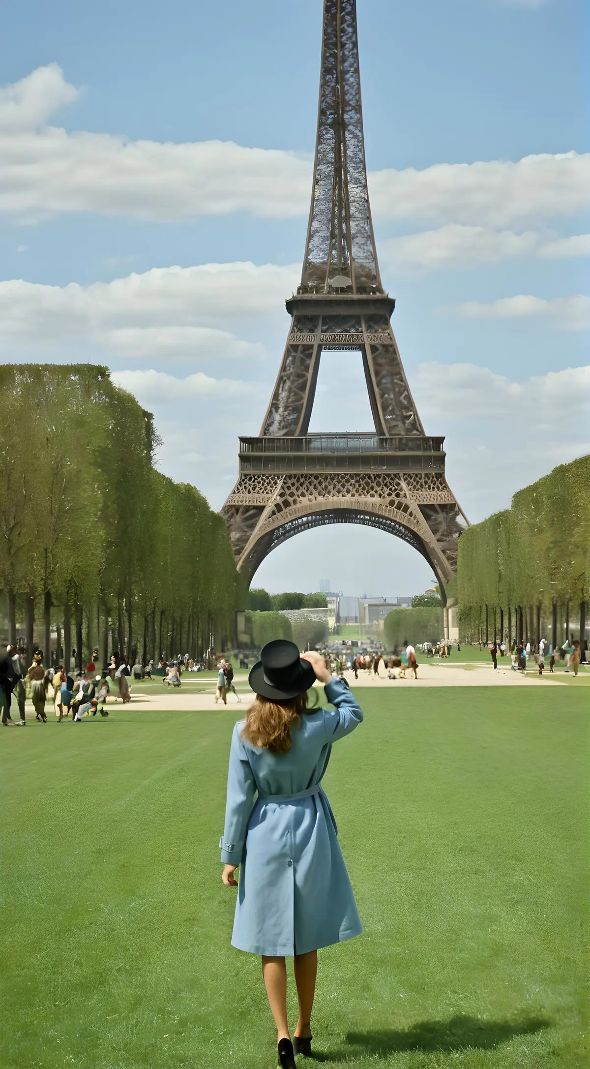 远处蔚蓝天空白云朵朵,埃菲尔铁塔耸立着离镜头很远。广阔的草坪上占满下1/2画面,草坪远处零星的人们在散步,稍近处的人在露营下午茶。最近处(画面最下缘)一个高挑法国女郎穿棕色风衣戴礼帽背对镜头举起相机记录下一切。