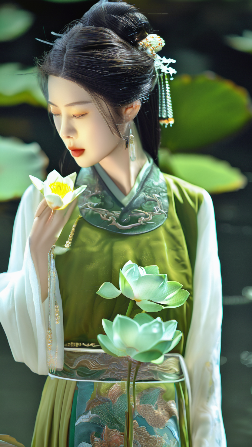 一个穿着绿色连衣裙的女人拿着象舞莲花