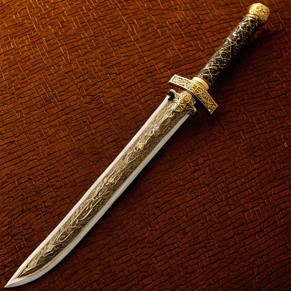 我们看到一柄充满神秘与传奇色彩的古剑。这剑长三尺有余,剑身修长,如流水般柔和却又刚韧。剑刃闪烁着寒光,仿佛能切割开空间,透露出一种凌厉而深邃的气息。剑柄上镶嵌着一块晶莹剔透的宝石,散发出淡淡的光芒,为这柄剑增添了几分高贵与神秘。剑鞘由珍稀的乌木制成,表面雕刻着繁复的图案,每一条纹路都仿佛诉说着古老的故事。