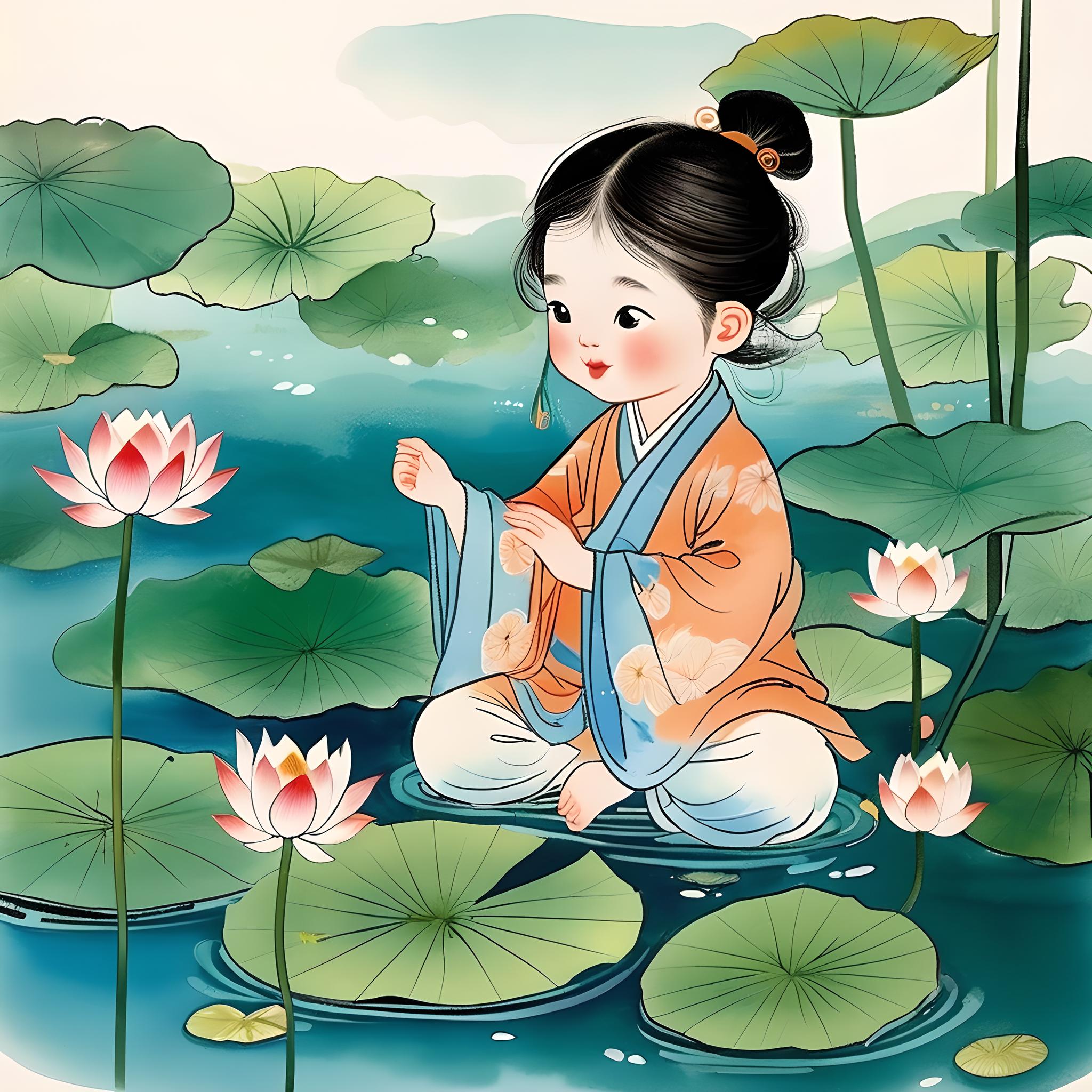 徐悲鸿儿童插画设计作品。水墨画 童趣 嬉戏 荷花 游玩 氛围感极强 小孩开开心心 蹦蹦跳跳 有故事趣味性