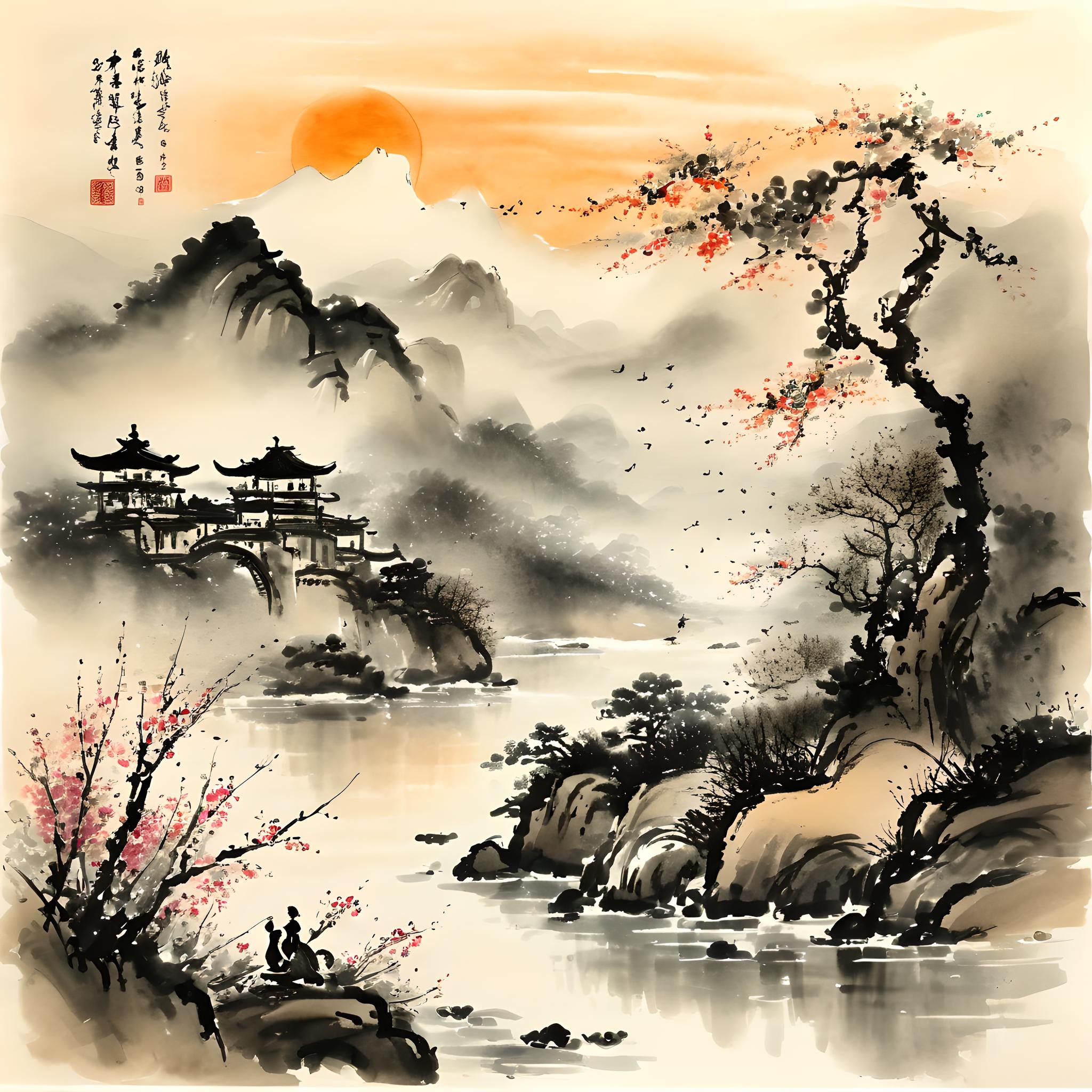 一道残阳铺水中,半江瑟瑟半江红。可怜九月初三夜,露似珍珠月似弓。根据白居易此诗进行生成,呈现S构图,能够将观者的视线从夕阳引到瑟瑟江水中,晚归的鸟儿纷纷回巢,夜晚的雾气也起来了,让人感觉到阵阵寒意。