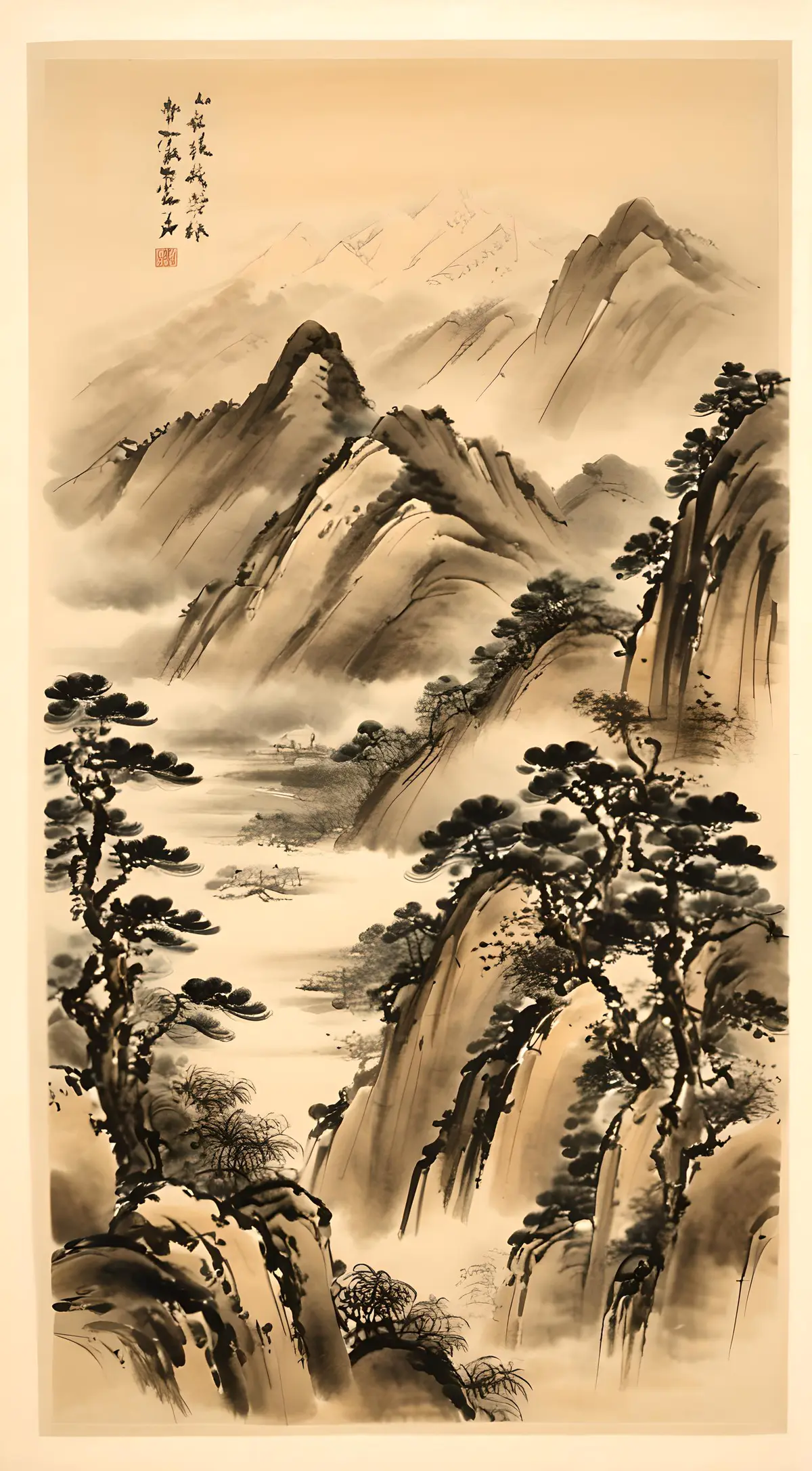 诗歌意境,水墨风格,高山,松树,