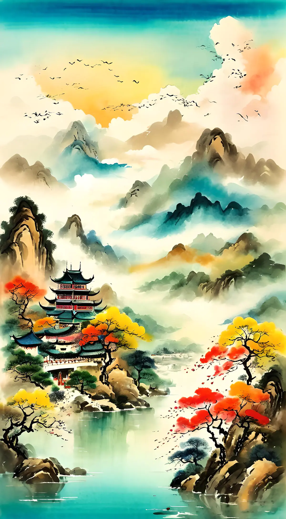 诗歌意境,国画风格,高山,寺庙,七彩祥云,