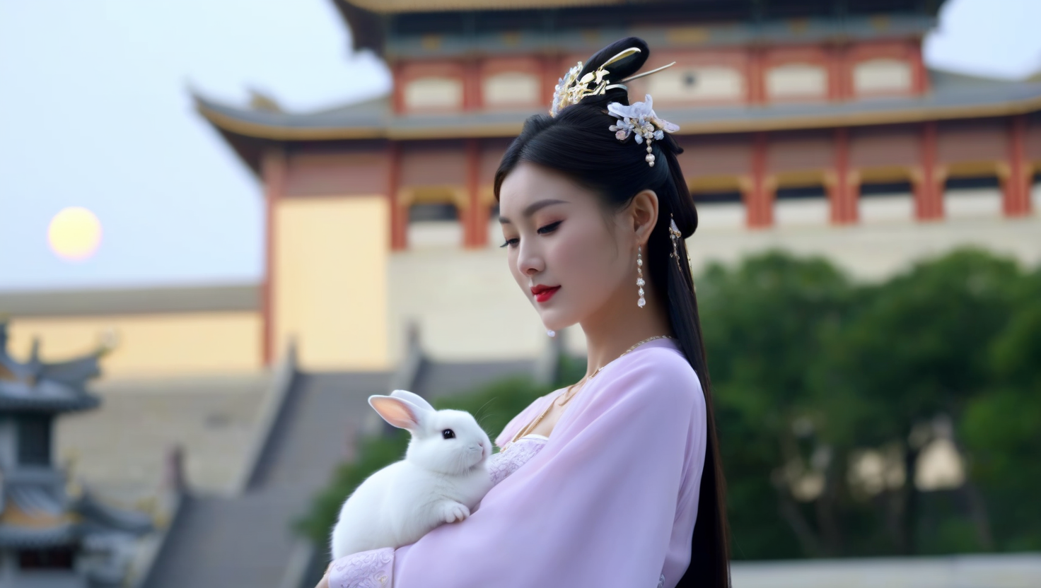 中国风,女仙子,嫦娥,背景为广寒宫,清冷风,抱兔子,月亮,思念丈夫