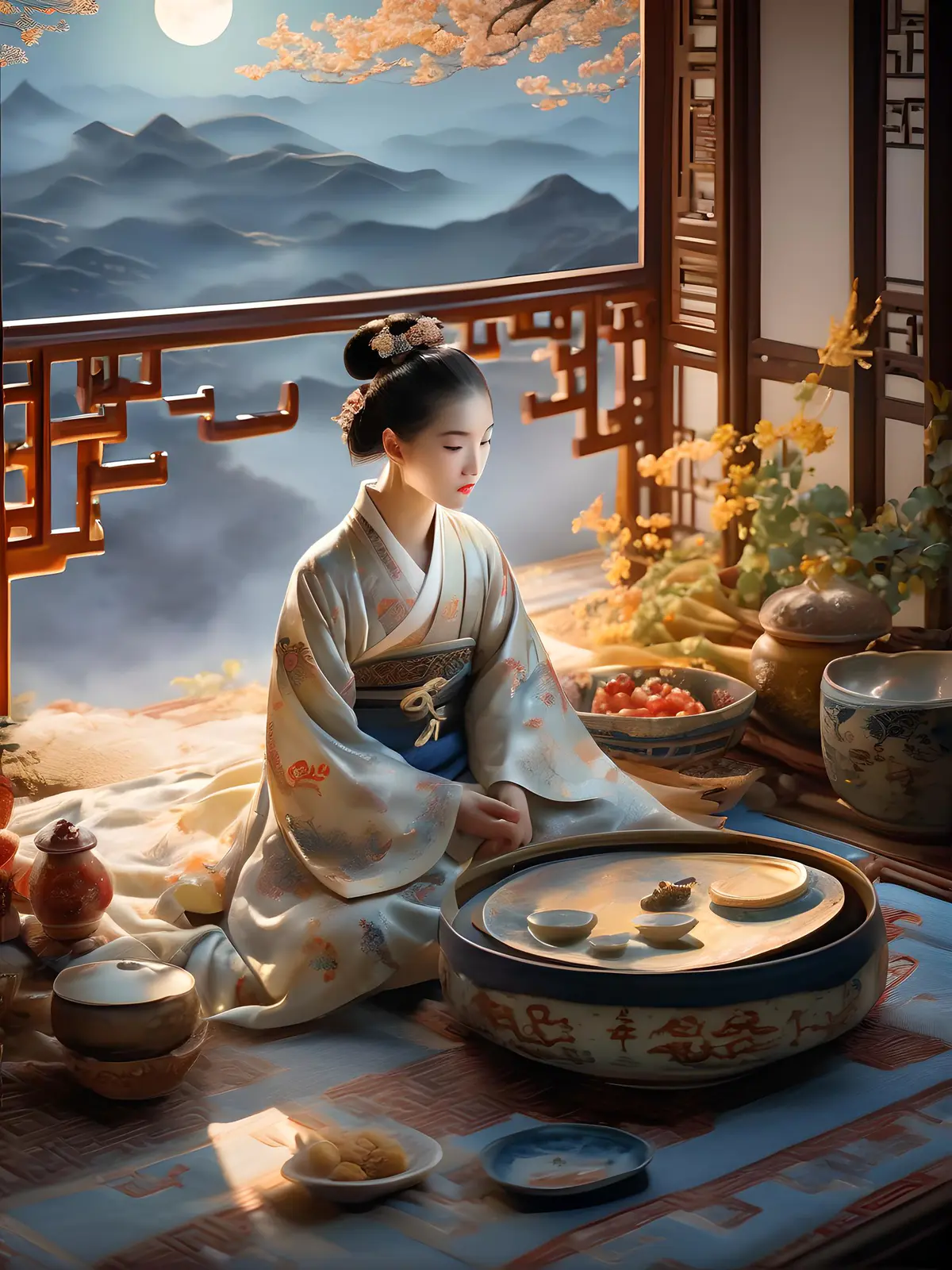 1个女孩,国色天香风格,中国风风格,中古/复古风格,中国龙,白釉凤纹盘,白瓷釉里碗 床前明月光 疑是地上霜 举头望明月 低头思故乡