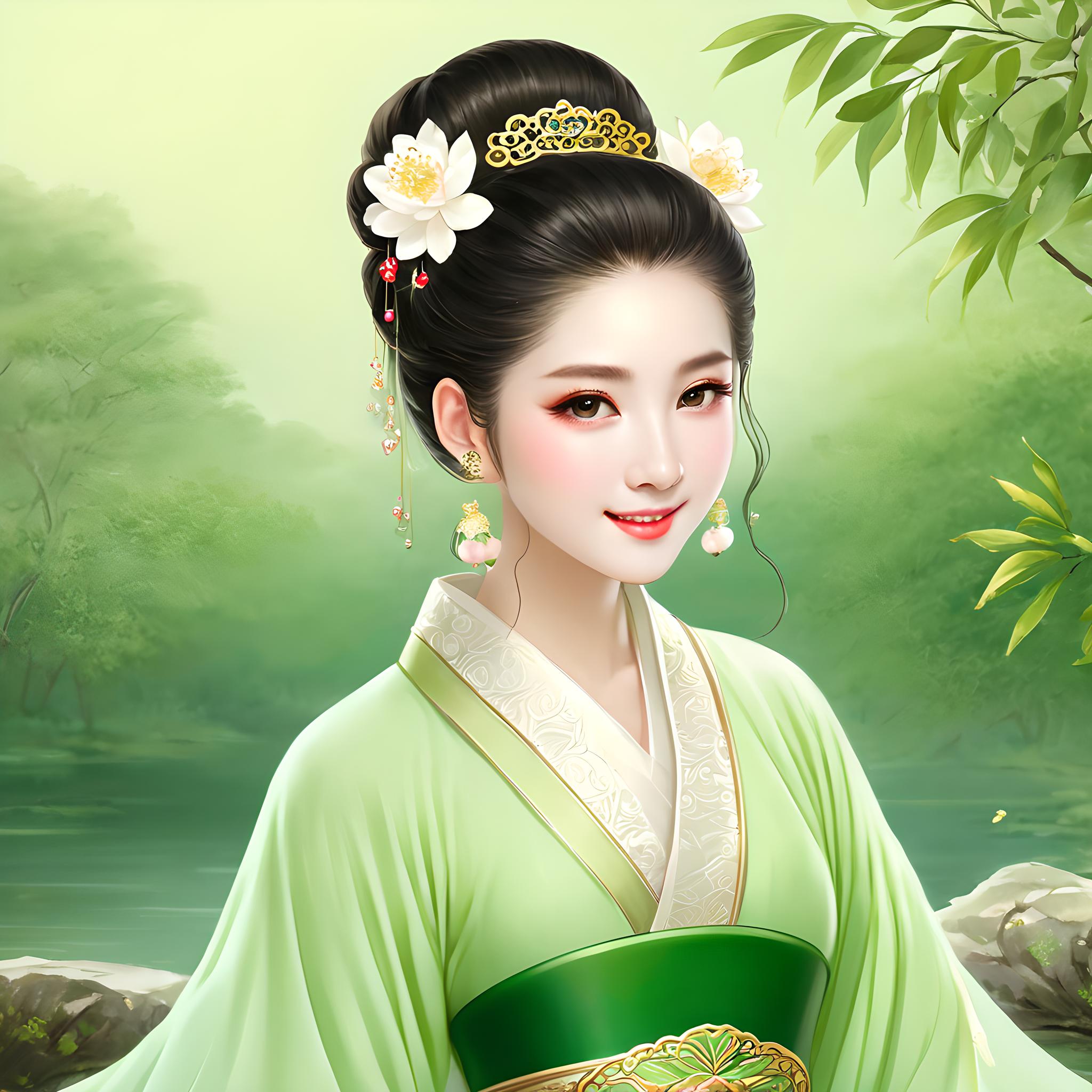 漫画,中国古风美人,在荷花池边回眸一笑,女子,二十几岁,瓜子脸,双眼皮,浓眉大眼,唐朝服饰,雍容华贵,淡绿色服装,腰上有一块玉佩,头戴金钗,银钗、玉簪、牡丹花