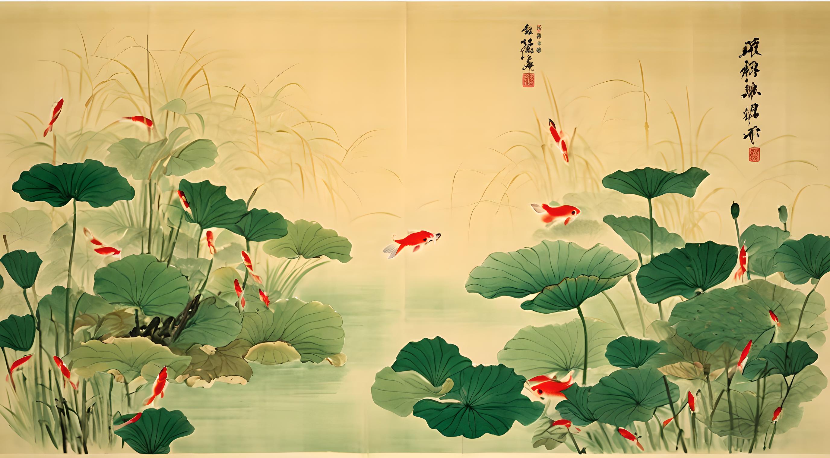 中国水墨画,工笔画质感,荷花池中,有几条红色小鱼若隐若现,