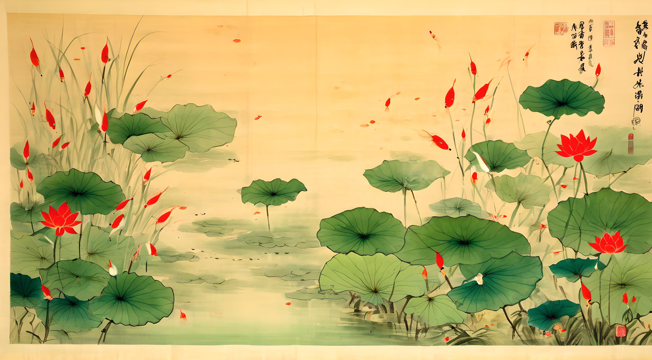中国水墨画,写意画质感,荷花池中,有几条红色小鱼若隐若现,