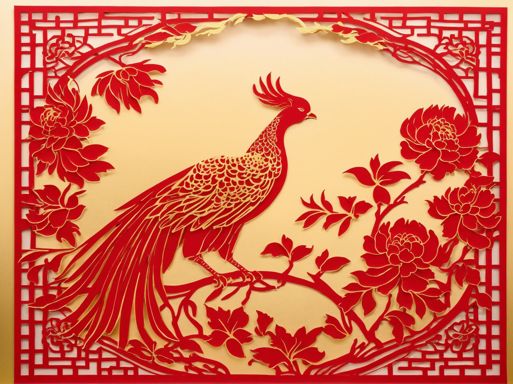 中国传统剪纸艺术描绘了郁郁葱葱的牡丹中优雅的凤凰。充满活力的红色和金色,复杂的图案,展示文化象征和工艺。柔和、漫射的灯光突出了精致的细节,营造出一种空灵的氛围。中国传统图案,和谐的构图,诱人的庆祝感