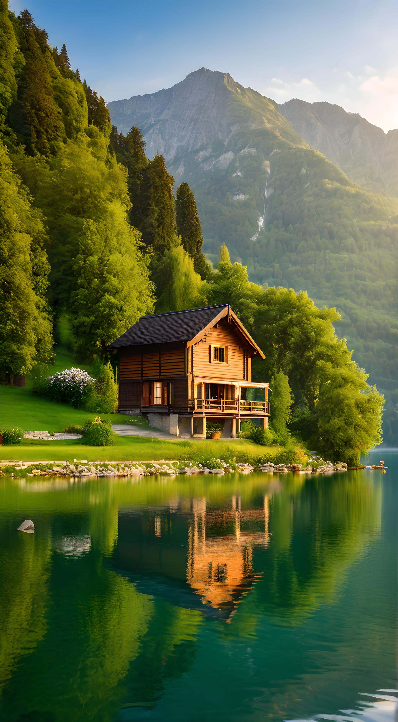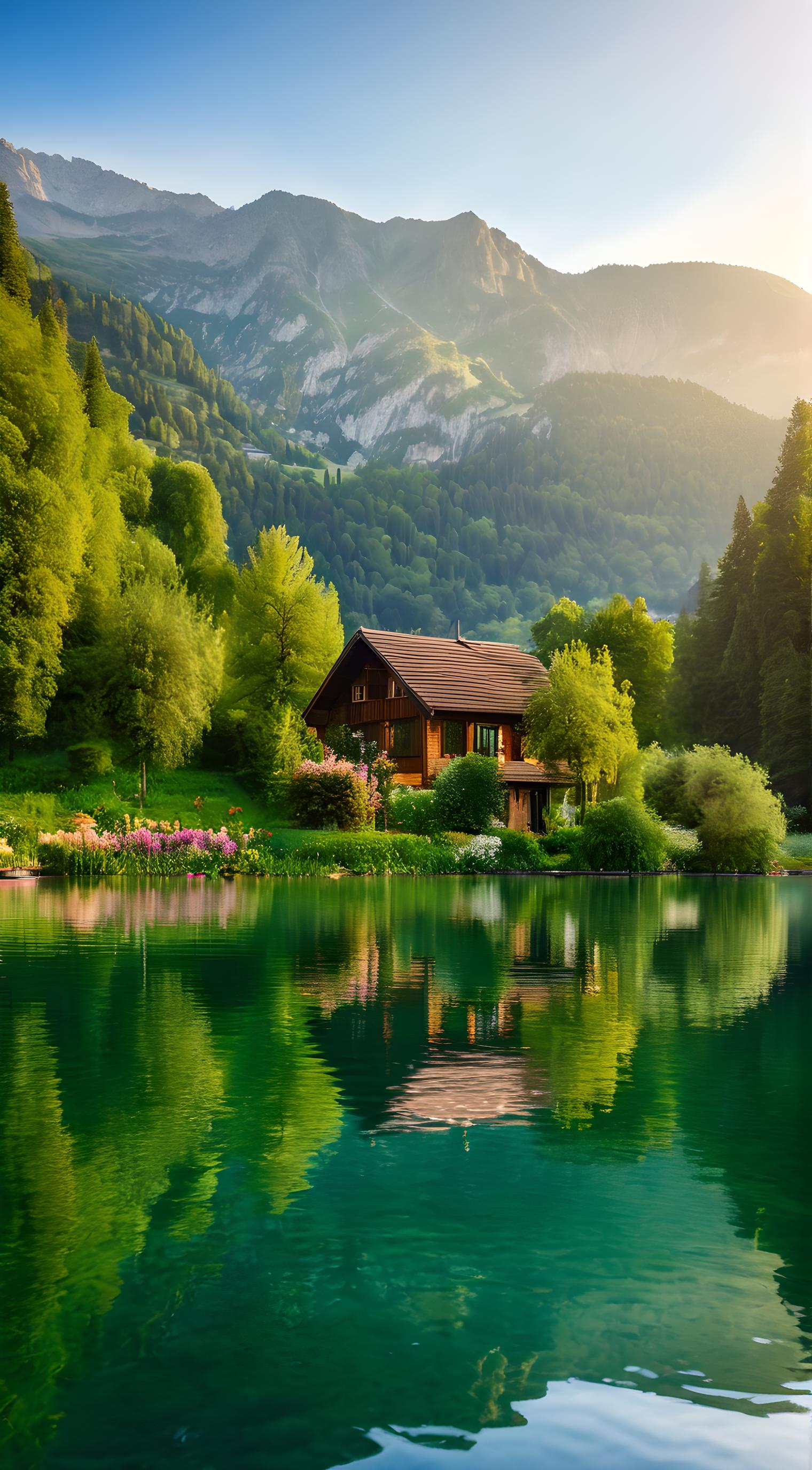 早晨,湖面宁静,周围是翠绿的山峦和树木。一座小木屋位于湖畔,水边开满了鲜花。水面上倒映着景色与晨光,摄影。