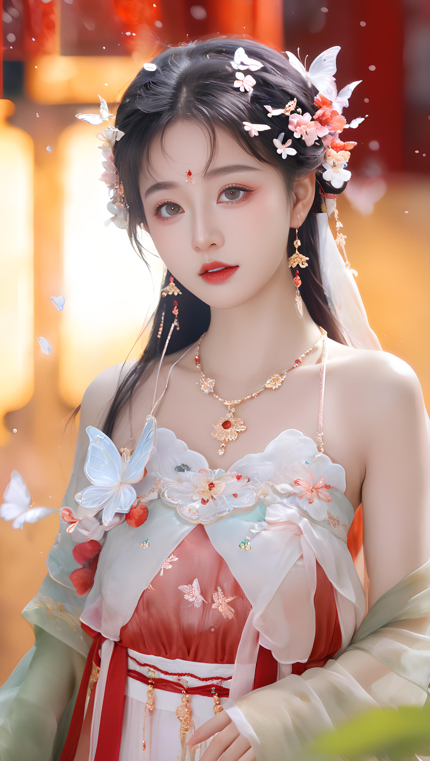 少女,挺胸丰满,多层透明丝绸全身镜,奢华丝滑亮红色雪纺泛光透视(幻彩,闪光,超薄,柔软,透明)液态汉服,云层,云彩,飞天的姿势,细节真实感,五官完美,特写明亮的大眼睛,胸部大,看着镜头,超细节,脸部细腻,超高清,真实皮肤,全身照,全身镜,高清照片,耳环