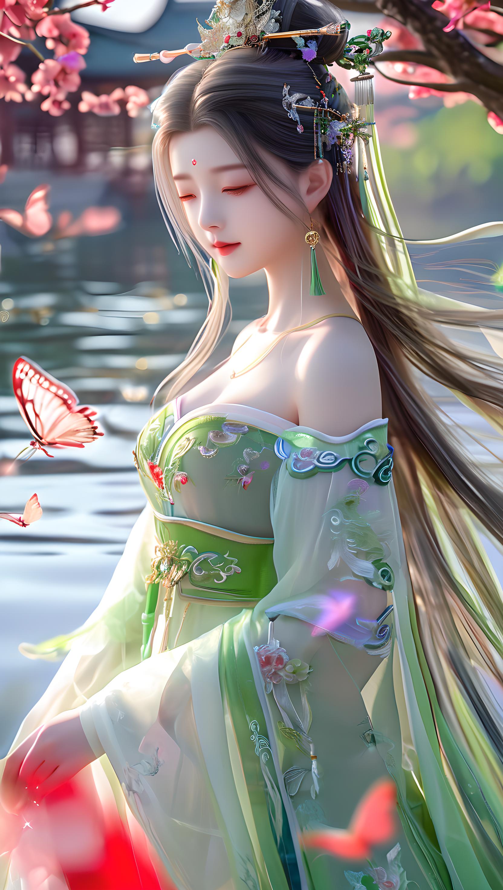 高细节 8k分辨率 超高分辨率 性感大胸美女 唐朝古装汉服 极美的青绿色薄纱刺绣吊带抹胸凤彩霓裳汉服(((超级结实圆润饱满的超级大胸))) 饱满火辣的S型身材, 奢华丝滑亮红色雪纺泛光透视(幻彩,闪光,超薄,柔软,透明)液态汉服,白色头发 精致的眼睛 微笑 神情富有神韵 江南水乡 唯美,浪漫 (((动态角度,面向观者,挺胸,侧身站立,全身镜头)))