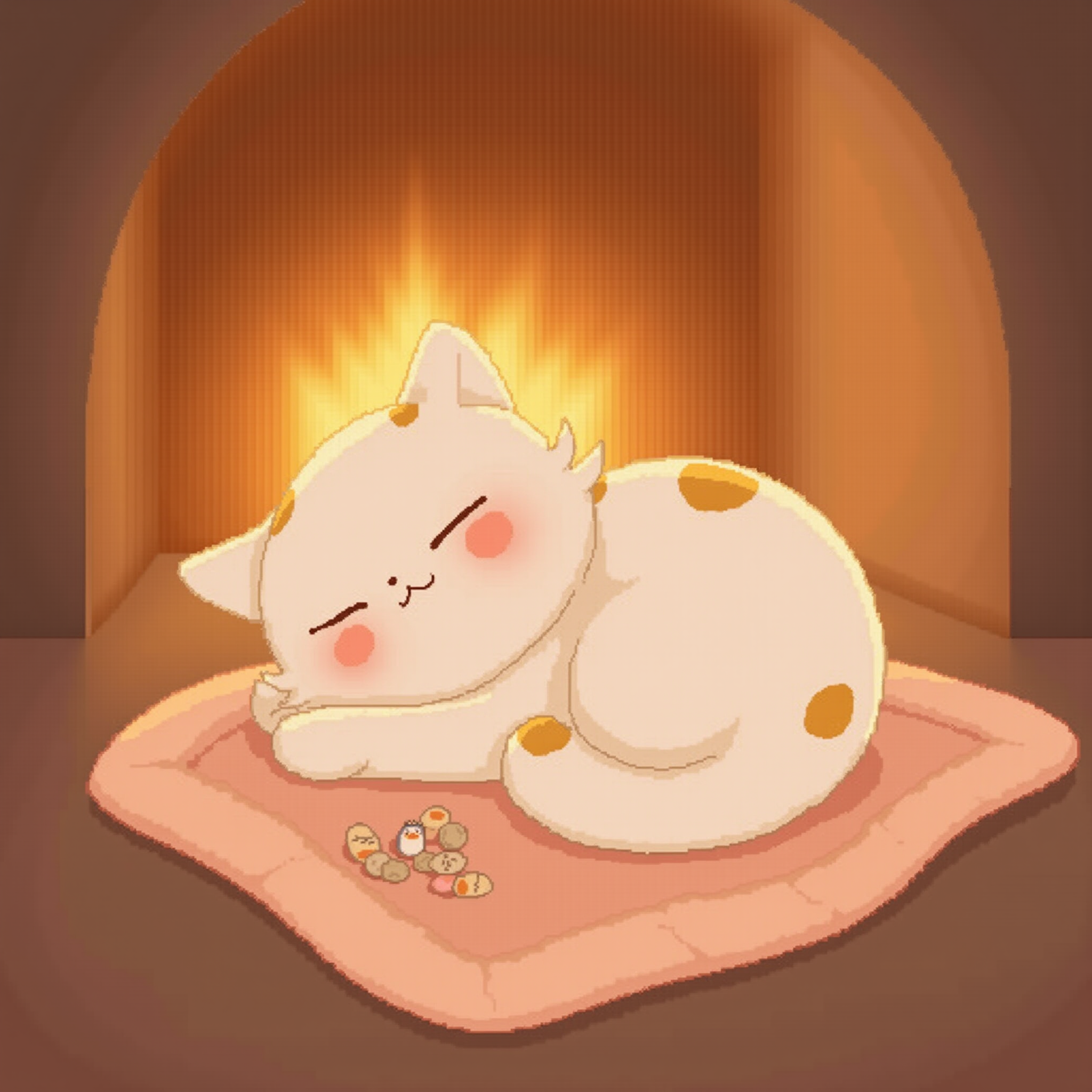在壁炉旁,温暖的火光映照着一个舒适的空间。你的猫咪蜷缩在一个柔软的毛毯上,白色的身体上点缀着橘黄色的斑点,显得十分可爱。它的脸上挂着满足的微笑,眼睛微闭,似乎在享受这个安静的午后。周围散落着一些玩具,透露出它调皮的一面。整个画面充满温馨和宁静的氛围。比例 16:9