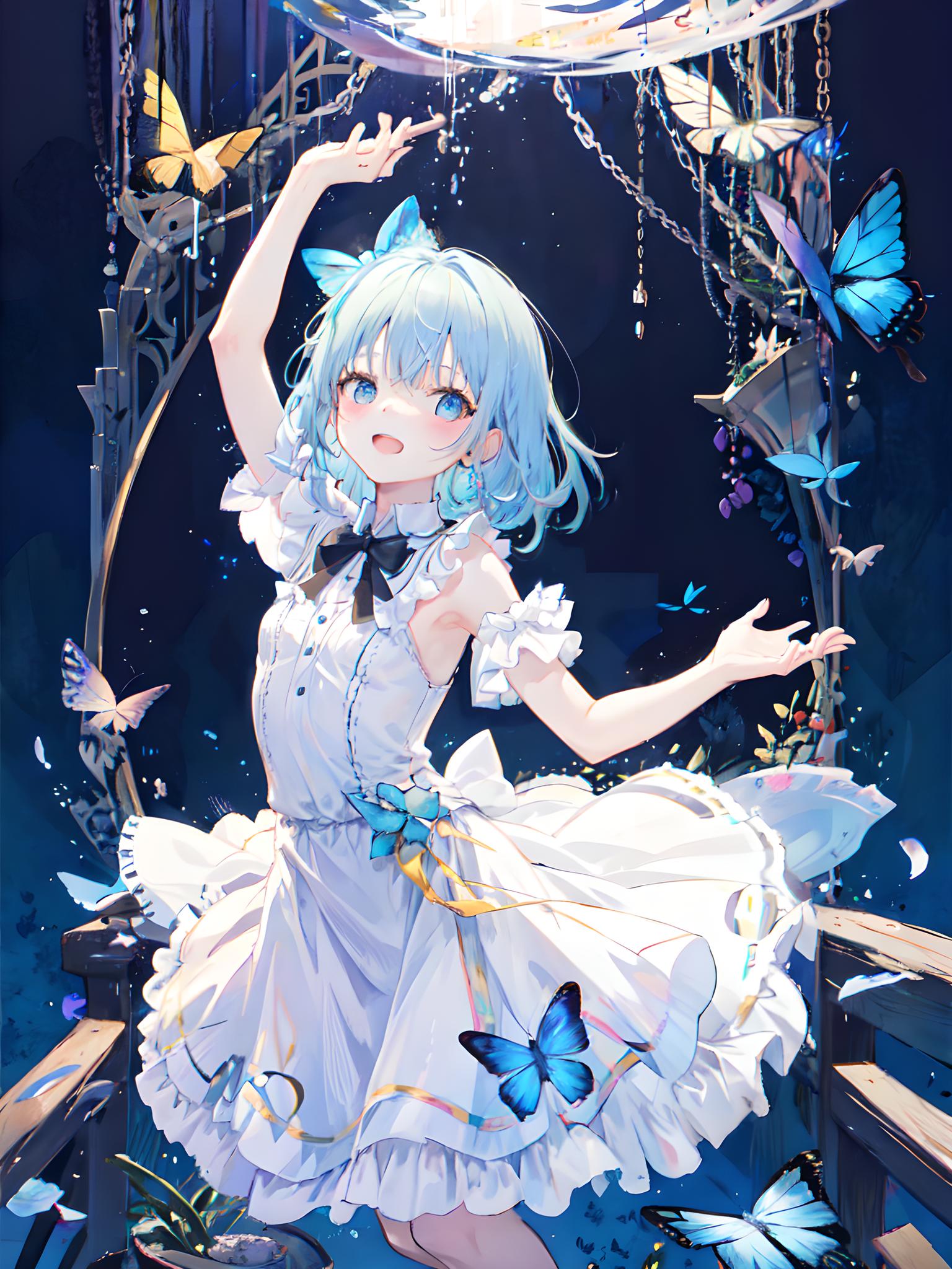 这幅插画展示了一位动漫风格的少女,她有着蓝色的头发和明亮的蓝色眼睛。她穿着一件白色的连衣裙,裙子上有蓝色的蝴蝶结和金色的装饰,整体风格显得非常可爱和优雅。她的周围环绕着许多蓝色的蝴蝶,增添了一种梦幻般的氛围。...