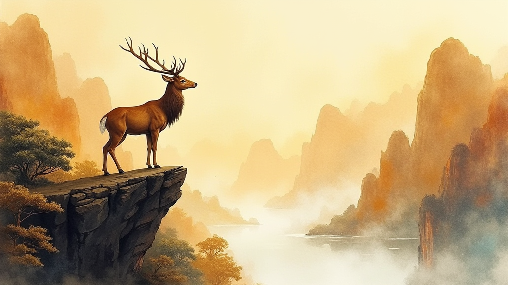 东方神话中的鹿站在悬崖上向天空呼唤