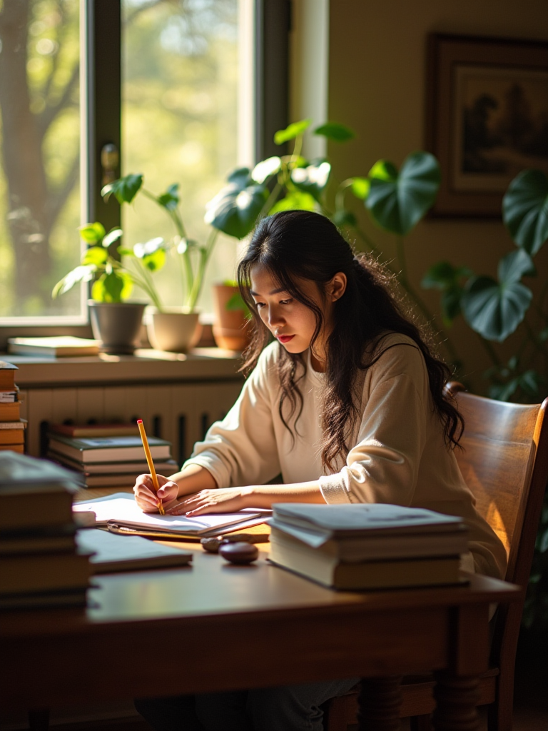 正在满是书籍的书桌上写作
