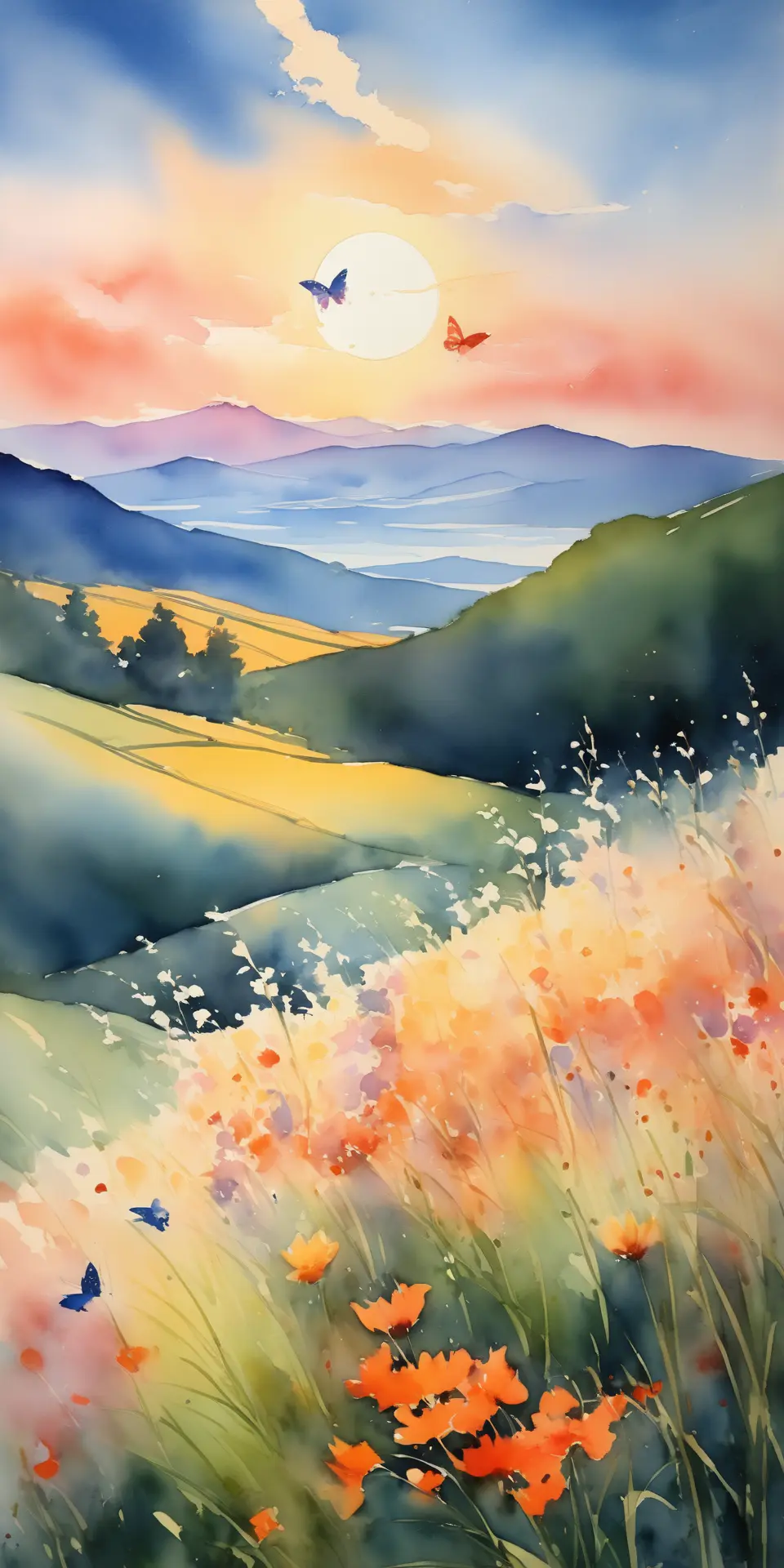 绛紫泼天。金黄炸开云脚。粉雾漫过丘峦。风一抖,蓝铃铛叮叮当当滚下山坡。
