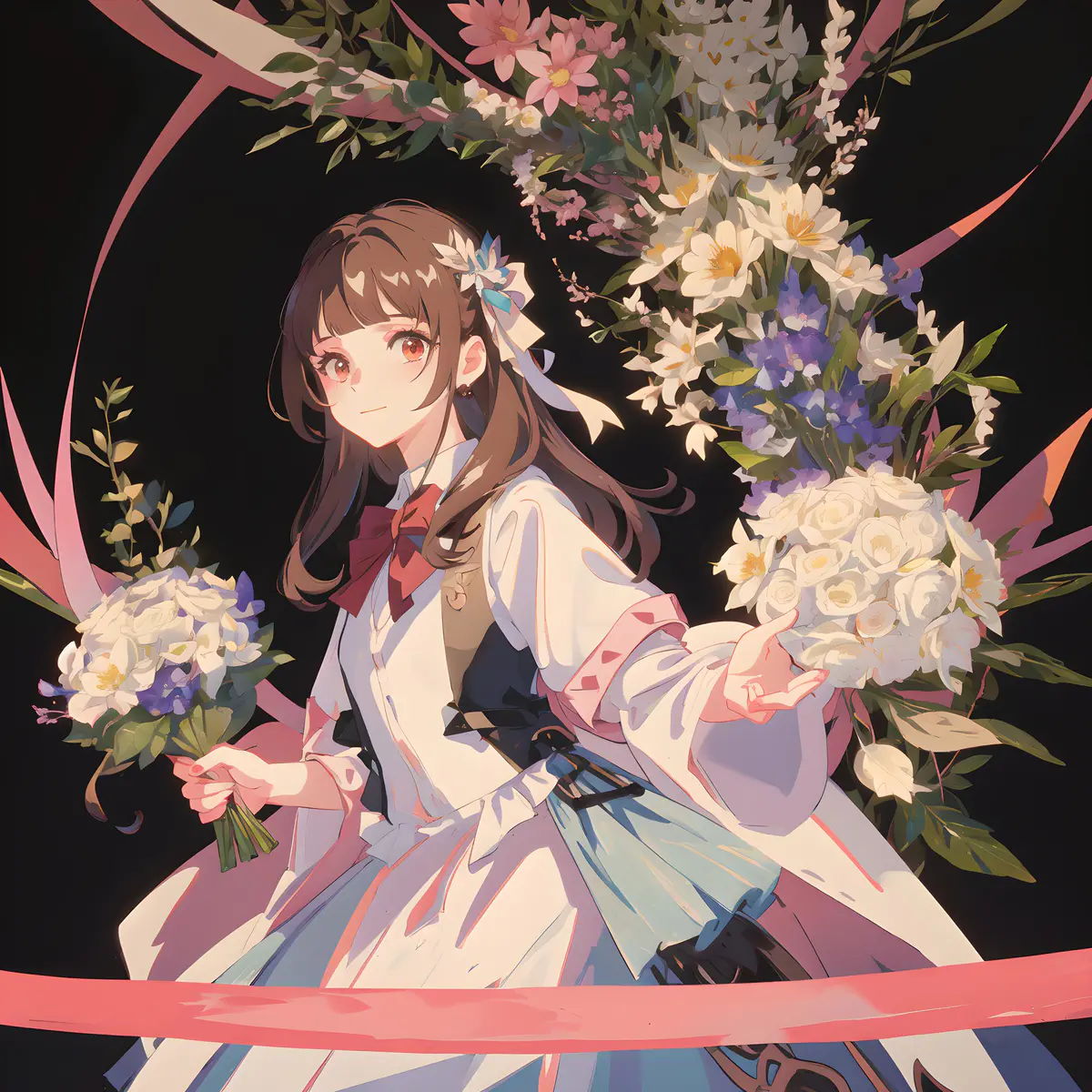 一个长发女孩穿着白色连衣裙,拿着一束花,一个长发女孩穿着粉色连衣裙,看着观众,脸红,微笑,刘海,棕色眼睛,黑色背景,蓝色头发,棕色头发,闭着嘴,耳环,有领衬衫,发花,从侧面,白色连衣裙,杰作,高质量