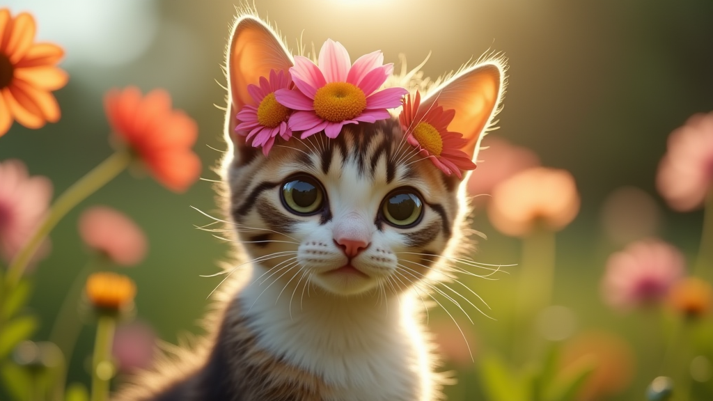 一只拟人化的猫咪头戴五颜六色的鲜花